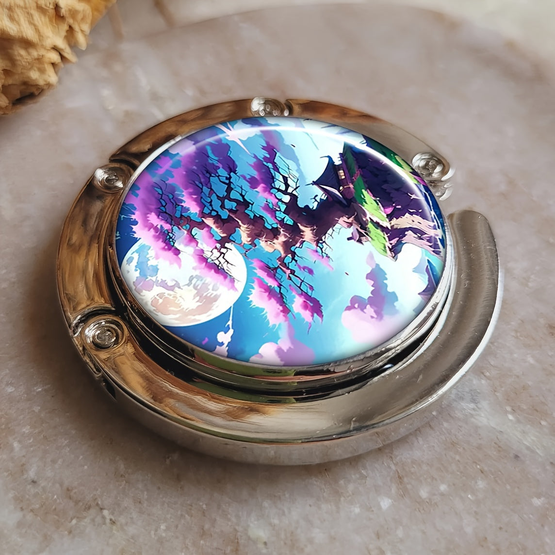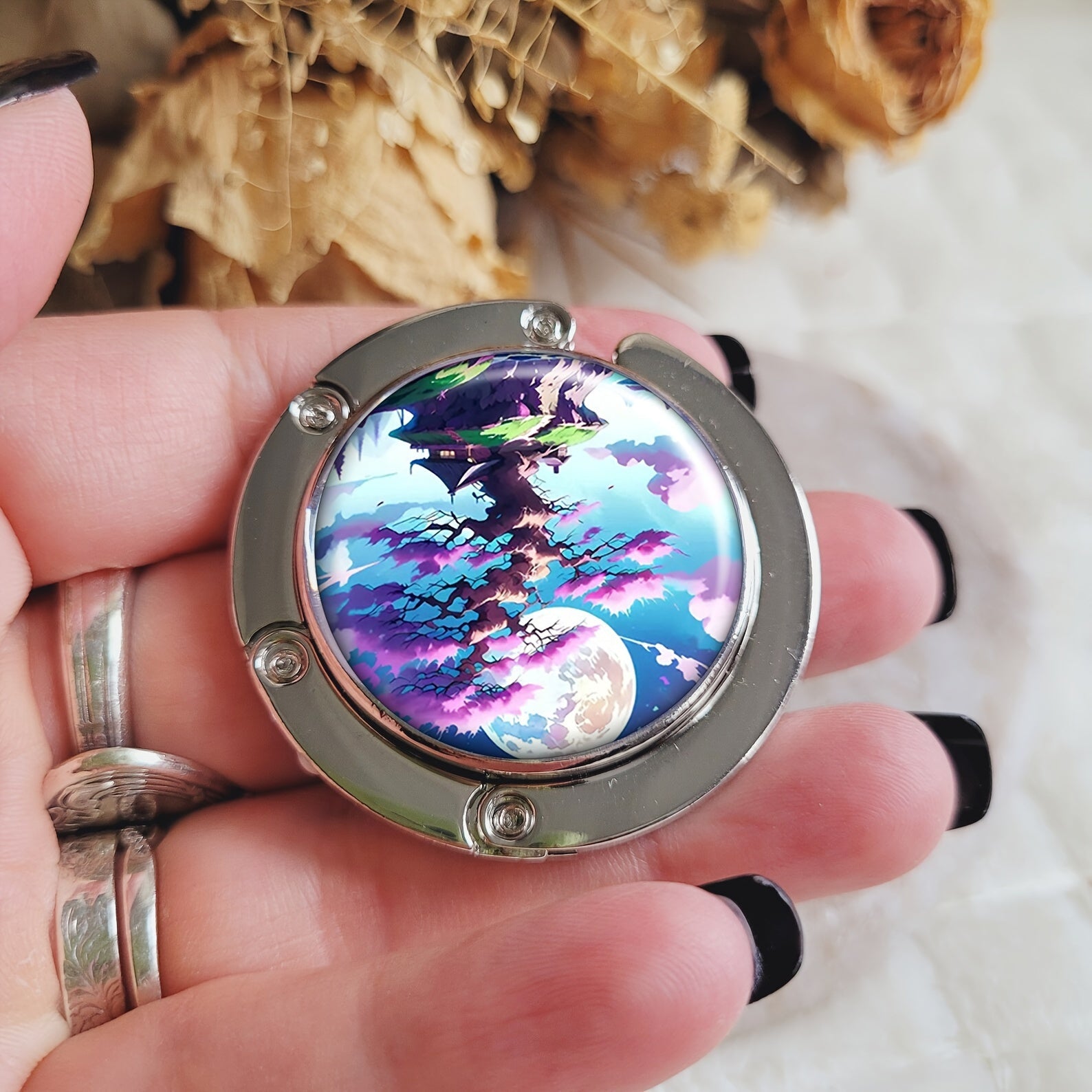 Folding Metal Purse Hanger with Cherry Blossom Tree and Moon Design Portable Handbag Hook Stylish Bag Holder