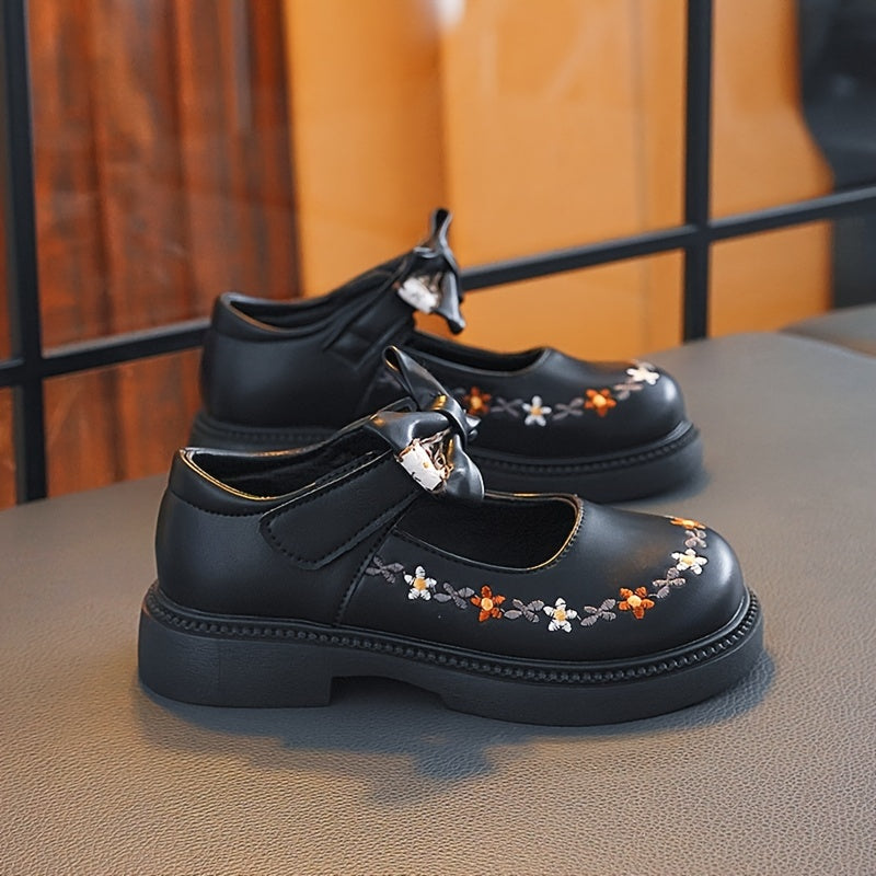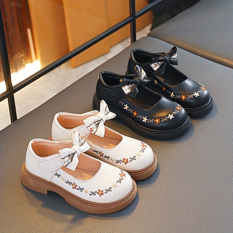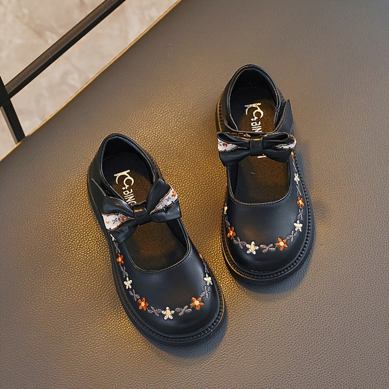 Girls' Mary Jane Shoes Fall 2024 Floral Embroidery Bow Non-Slip Rubber Sole