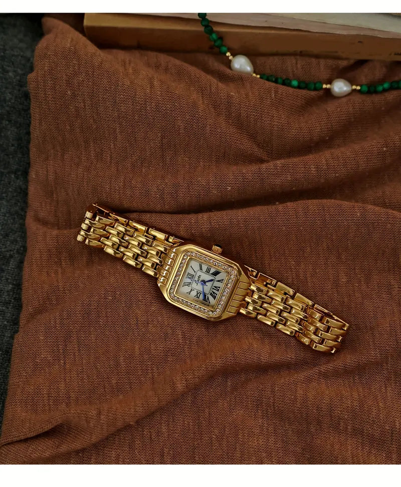 Gold-Tone Square Watch Water-Resistant with Roman Numerals and Water Drops for Women