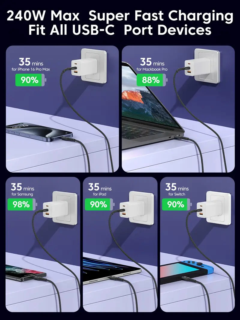 240W Nylon Flat USB-C to USB-C Fast Charging Cable with Matte Finish for iPhone Samsung Xiaomi OnePlus Pixel