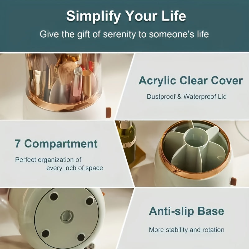 360-Degree Rotating Makeup Organizer Dustproof Compartments for Brushes Lipsticks Eyebrow Pencils