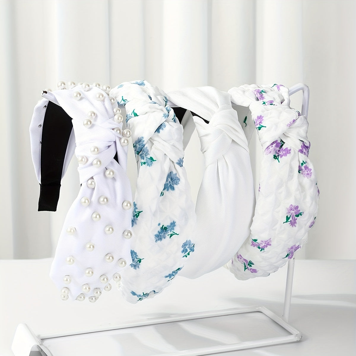 Set of 4 Women's Fabric Floral and Polka Dot Knotted Headbands with Faux Pearl Details
