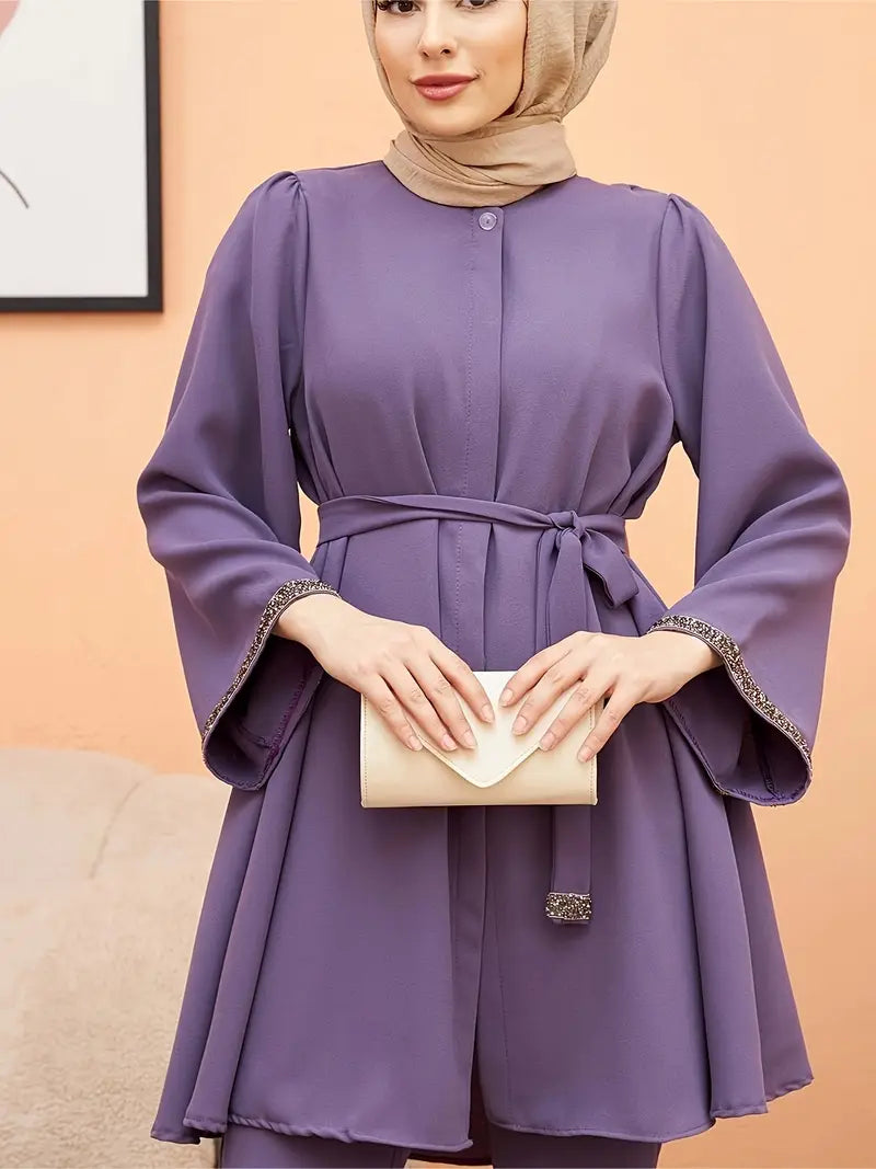 Women's Midi Rhinestone Top Long Sleeve Solid Polyester Belted Middle Eastern Style