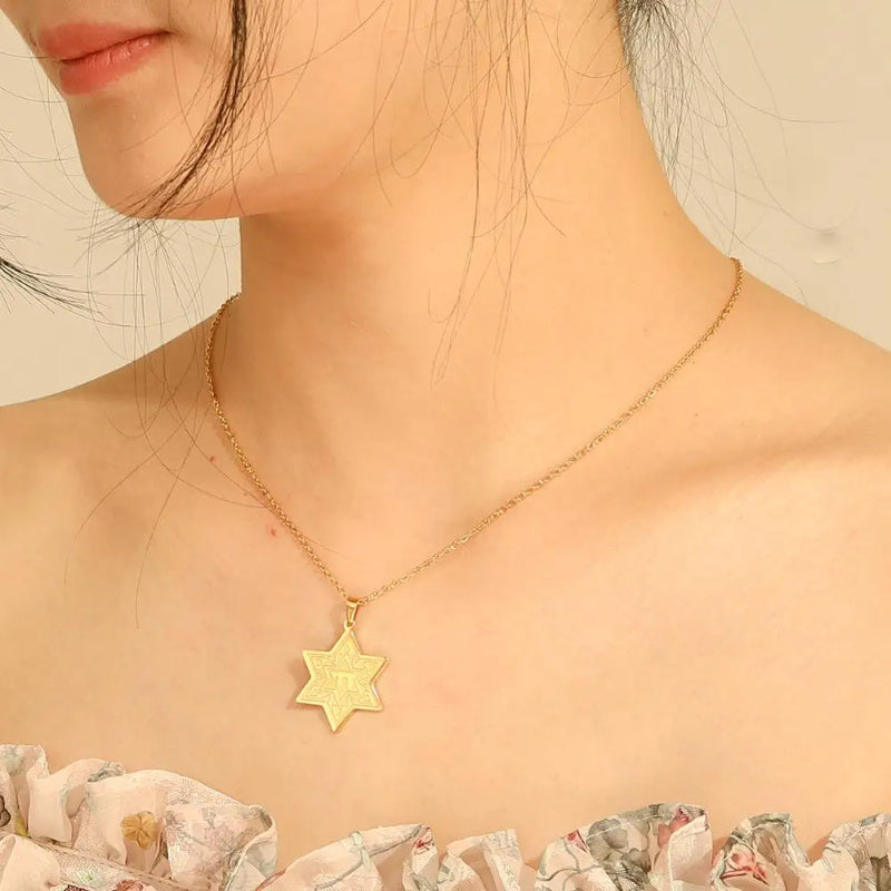 Hexagonal Star of David Pendant Necklace Titanium Steel Hebrew Letter Charm Religious Jewelry for Men Women