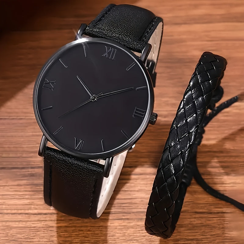 Black Round Quartz Watch with PU Leather Strap Alloy Dial and Pointer for Women and Men
