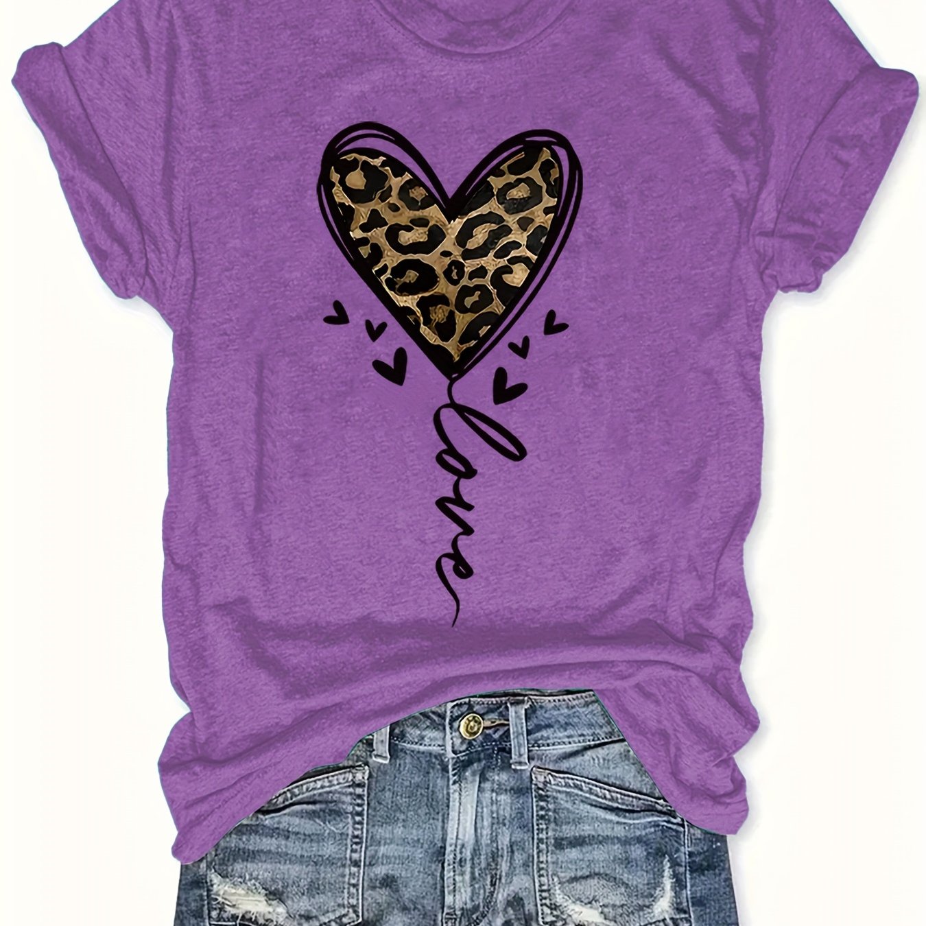 Plus Size Leopard Heart Print T-Shirt Casual Short Sleeve Top for Women