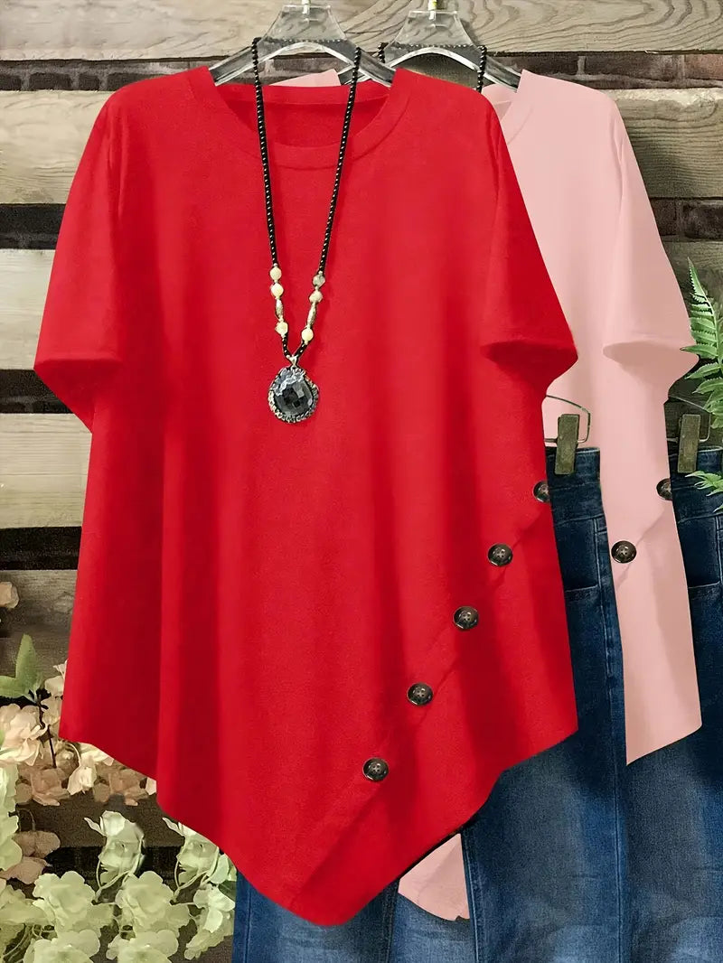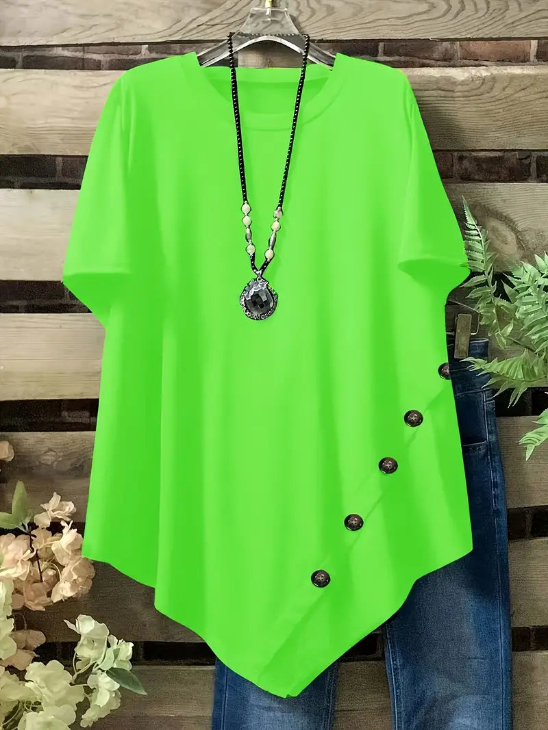 Plus Size Loose Fit Short Sleeve Casual T-Shirts with Button and Asym Hem