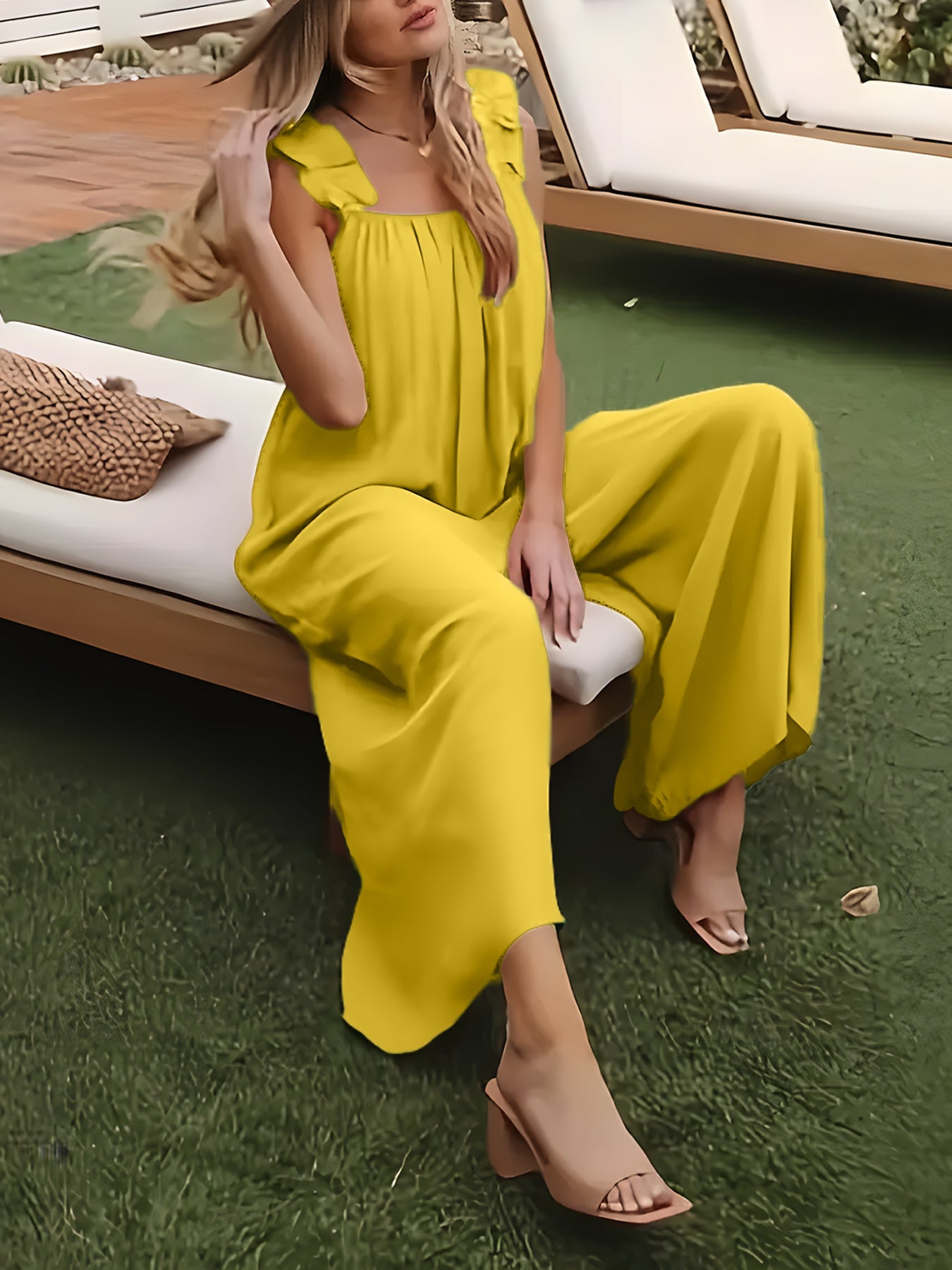 Plus Size Women's Black Sleeveless Jumpsuit with Ruffle Detail and Wide-Leg
