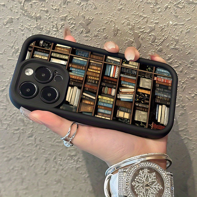 Black Anti-Fall Phone Case for iPhone 7-16 with Retro Bookshelf Design TPU