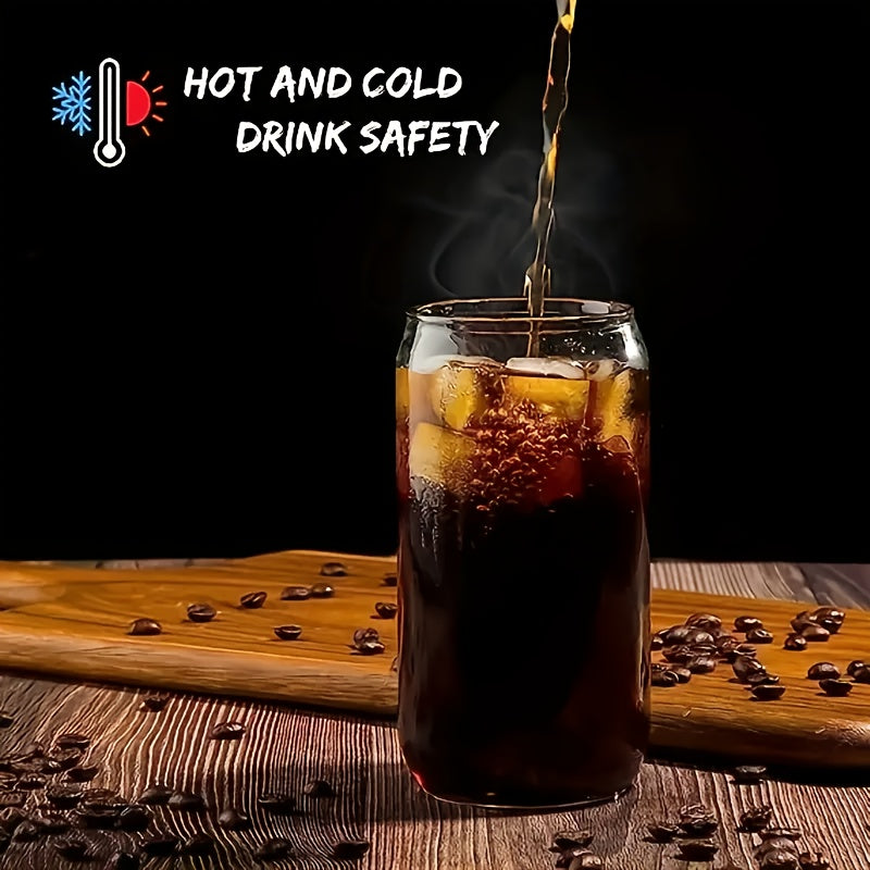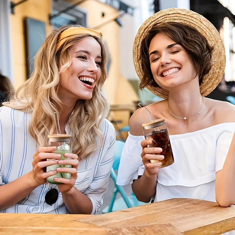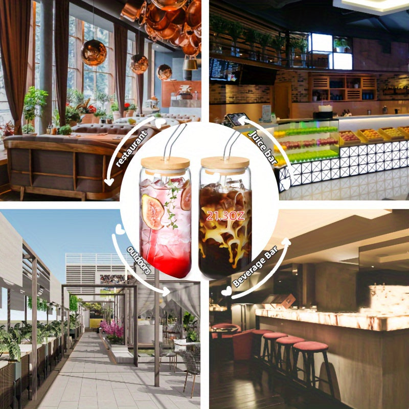 Set of 4 Borosilicate Glass Drinking Cups with Bamboo Lids and Glass Straws