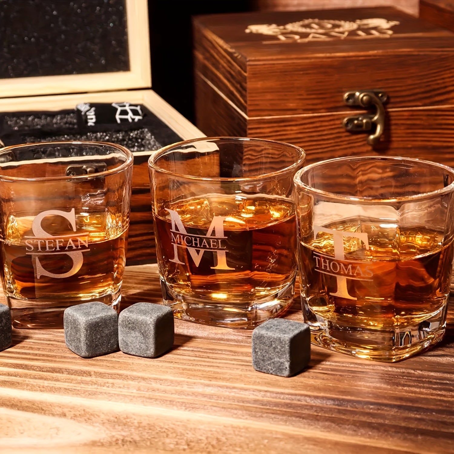 Set of 4 Personalized Whiskey Glasses with Wooden Box Gift Set for Groomsmen Fathers and Bachelors