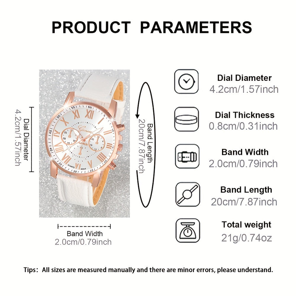 Set of 5 White Quartz Watches with PU Leather Straps and Rhinestone Jewelry for Women