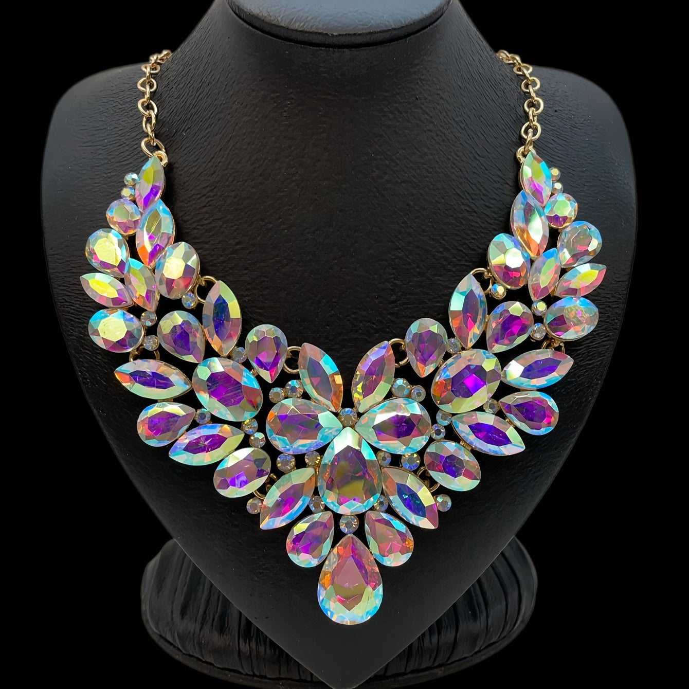 Faux Crystal Bib Necklace with Colorful Iced Out Design for Parties and Events