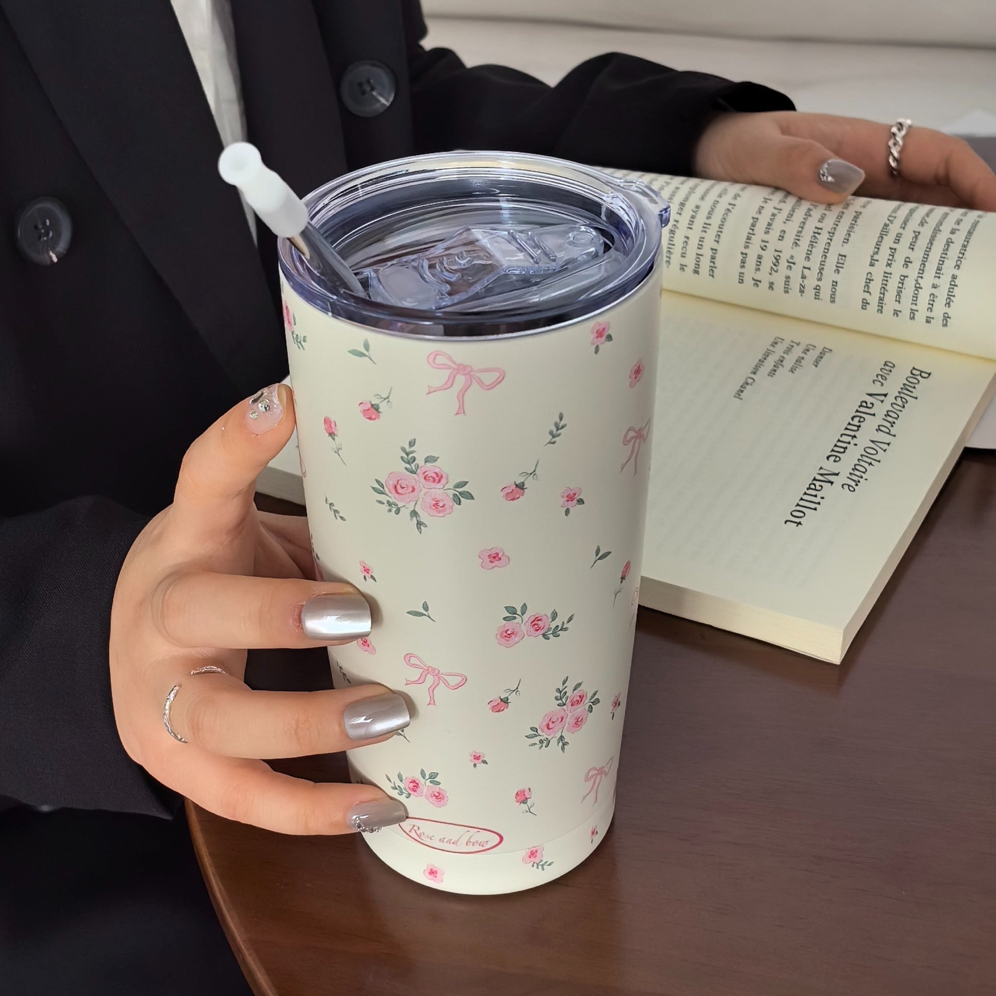 Insulated Stainless Steel Travel Mug with Rose Floral Butterfly Design Double Wall Hot Cold Beverage Tumbler
