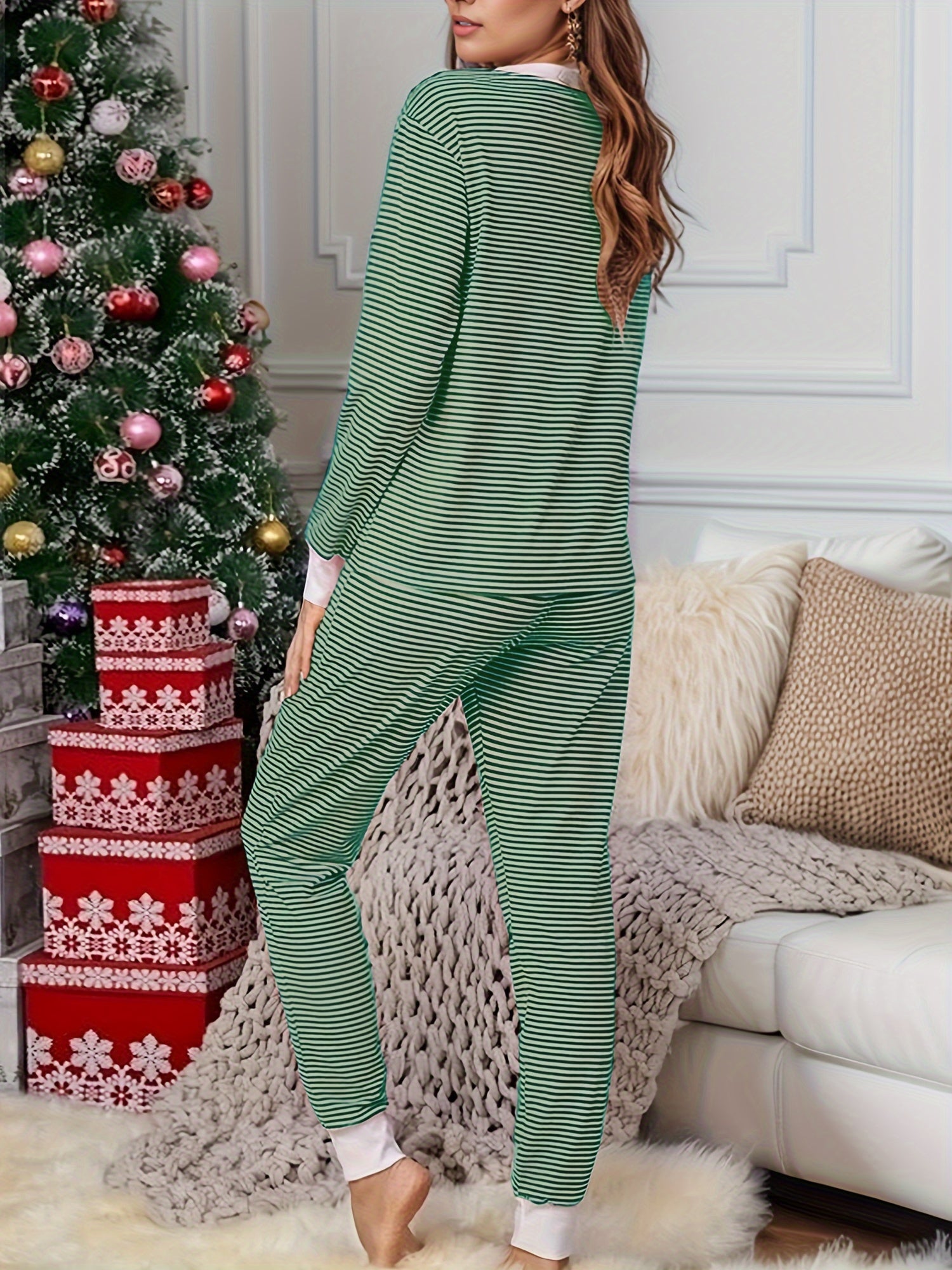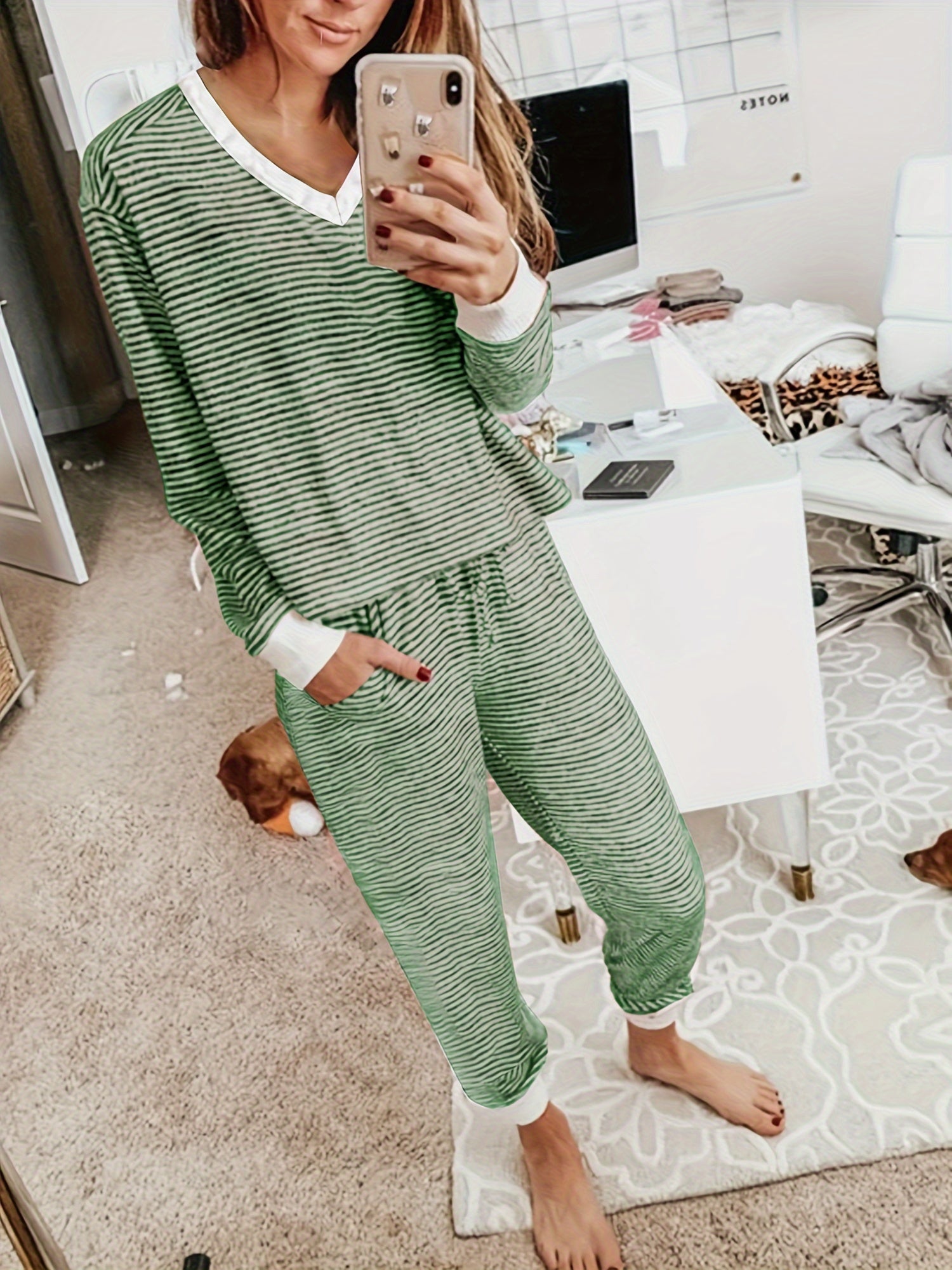 Adult Striped V-Neck Knit Loungewear Set with Long Sleeves and Pants