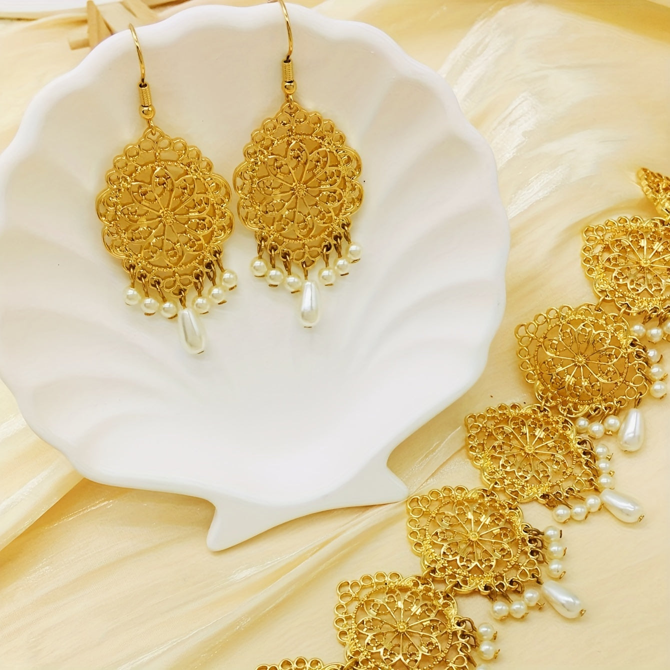 Indian-Inspired Jewelry Set 3-Piece Gold-Tone Necklace and Earrings with Pearl Drops