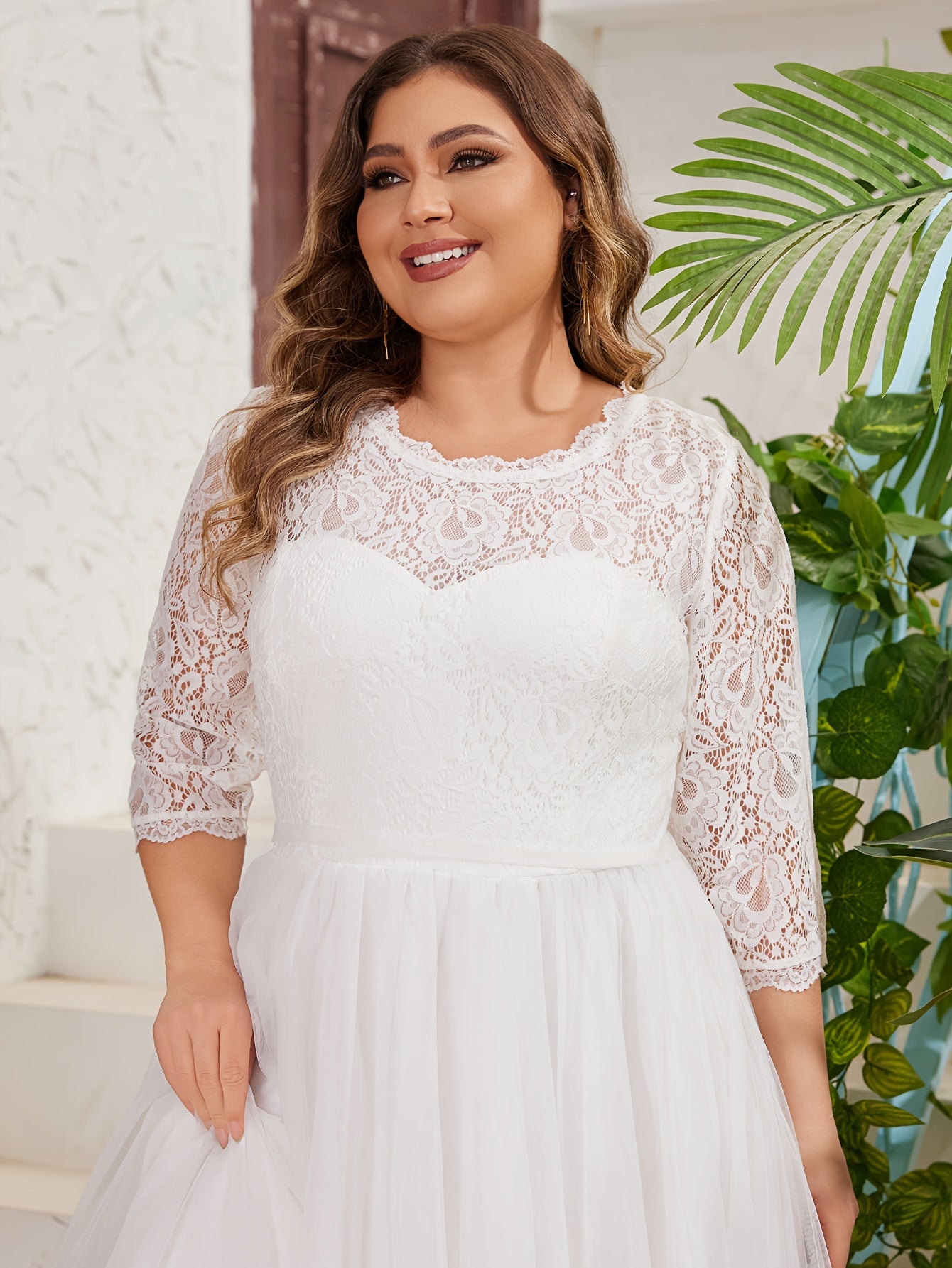 Plus Size Wedding Dress with Lace Trim A-Line Gown Long Sleeve Tulle Overlay