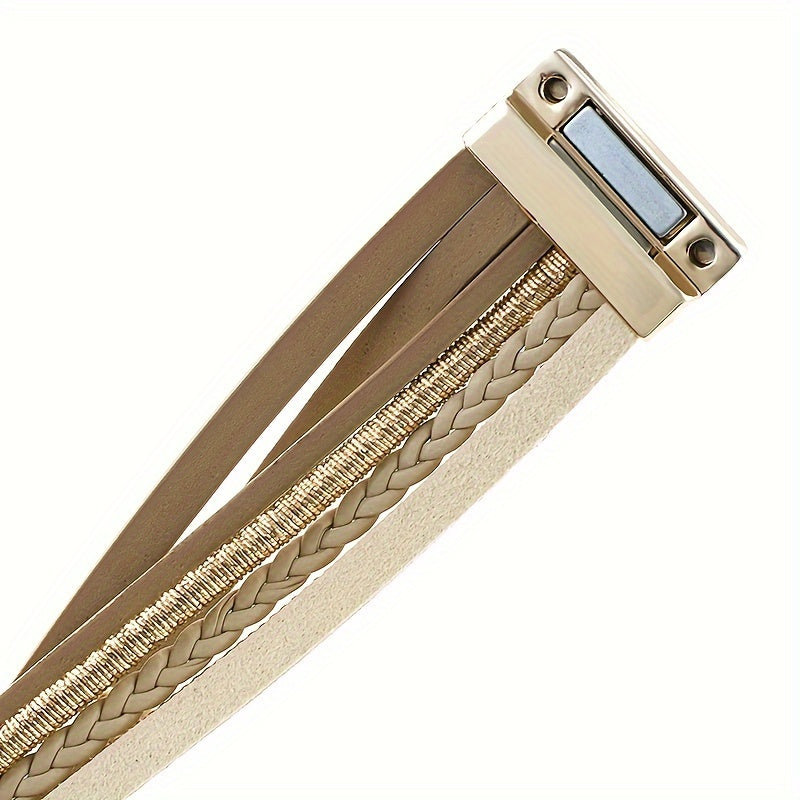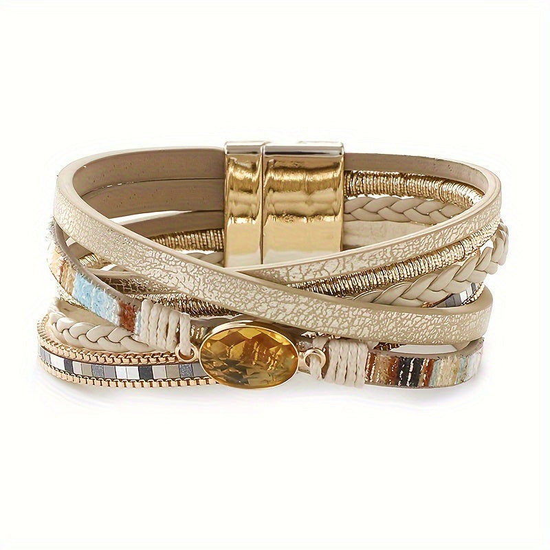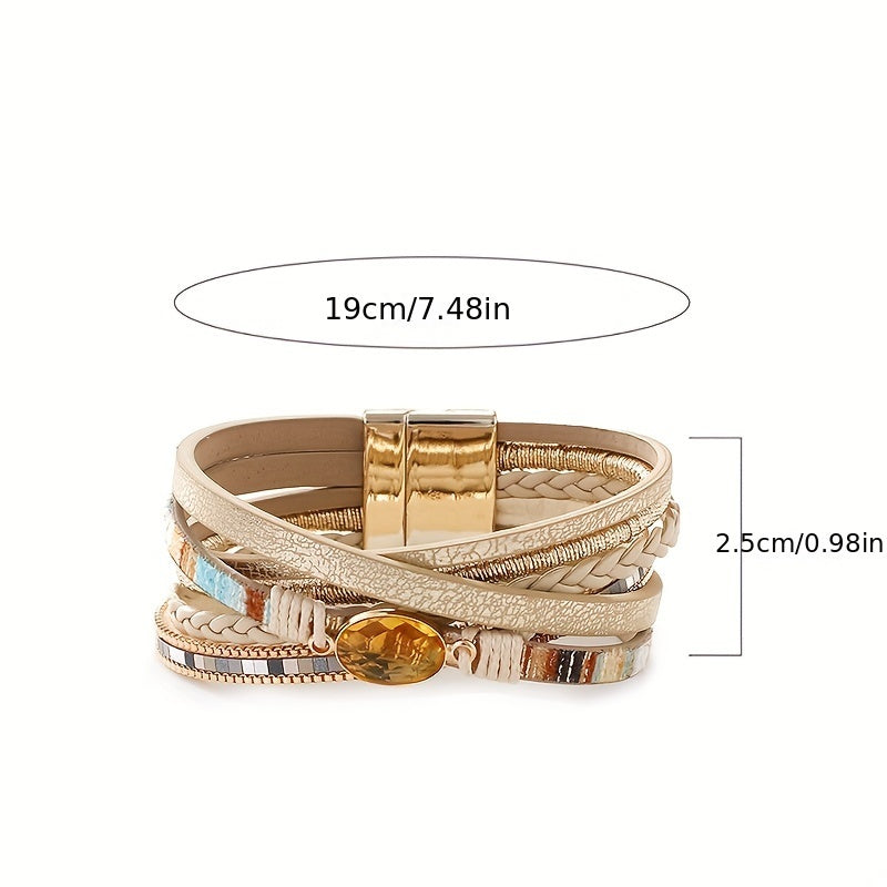 Vintage Bohemian Crystal Beaded Bracelet with Faux Leather Wrap and Magnetic Clasp