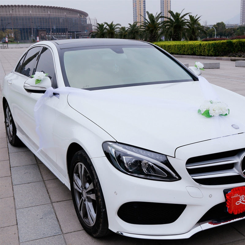 White Rose Car Roof Garland with Door Handle Ribbons 120cm Wedding Decor