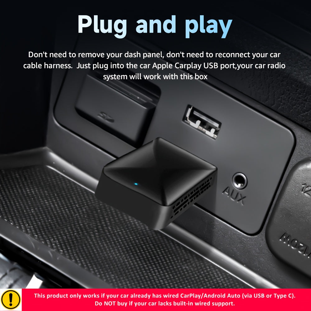 Requirements for buying this itemYour vehicle needs to have factory-installed wired CarPlay or Android Auto, and it shouldn't be a modified version. The easiest way to verify this is by connecting your phone to the car using a data cable to check for wired Apple CarPlay or wired Android Auto compatibility. This device merely transforms your car's wired CarPlay or Android Auto into a wireless version. If your car lacks the original manufacturer's support for wired CarPlay or Android Auto, please refrain from purchasing this product!Please be aware that this does not apply to BMW or Tesla.In case you are uncertain about the usability of your vehicle, or if you face any issues while using it after buying, kindly check the Q&A section of the electronic manual provided above.-2-in-1 Capability: Merges Wireless CarPlay and Android Auto into a single compact USB adapter for effortless connection.