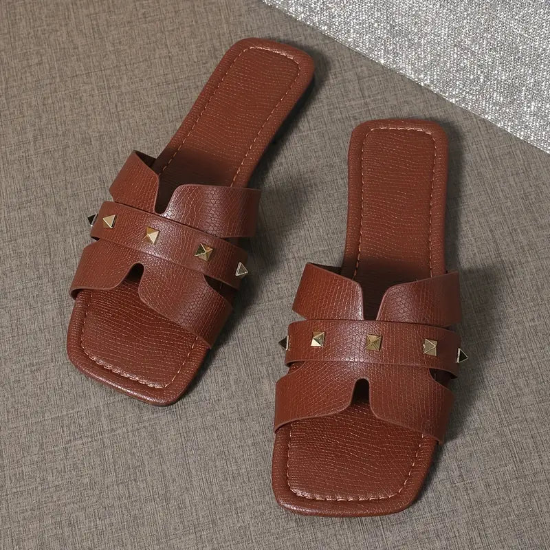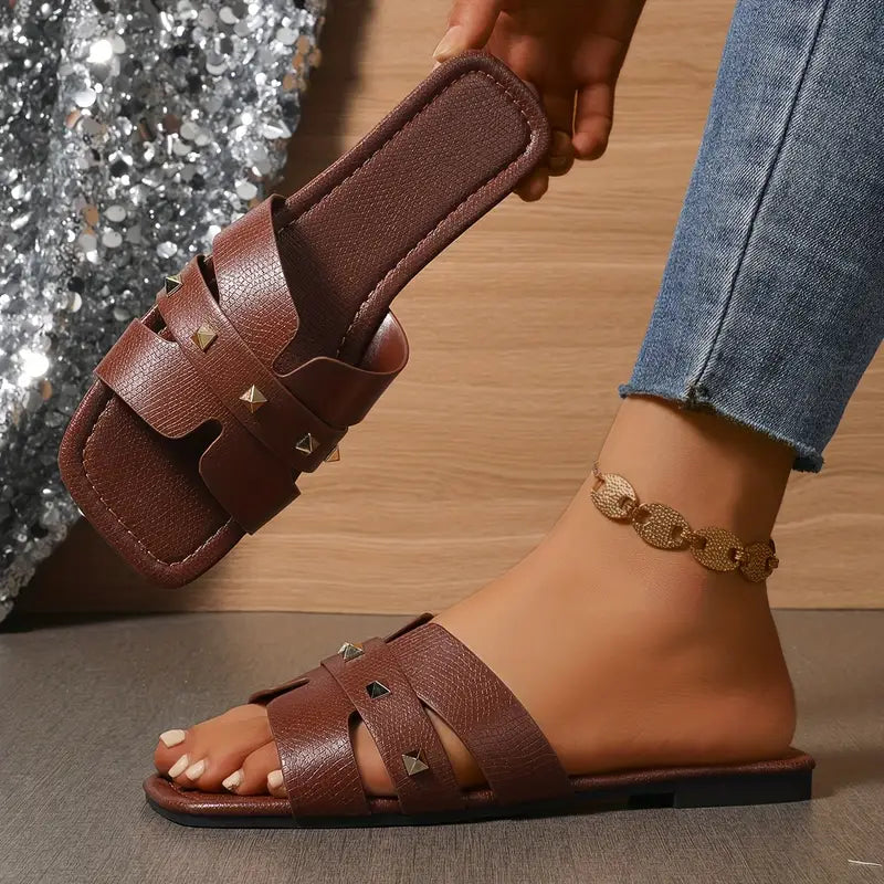 Women's Flat Sandals Solid Color PU Open Toe Slip-On Casual Shoes