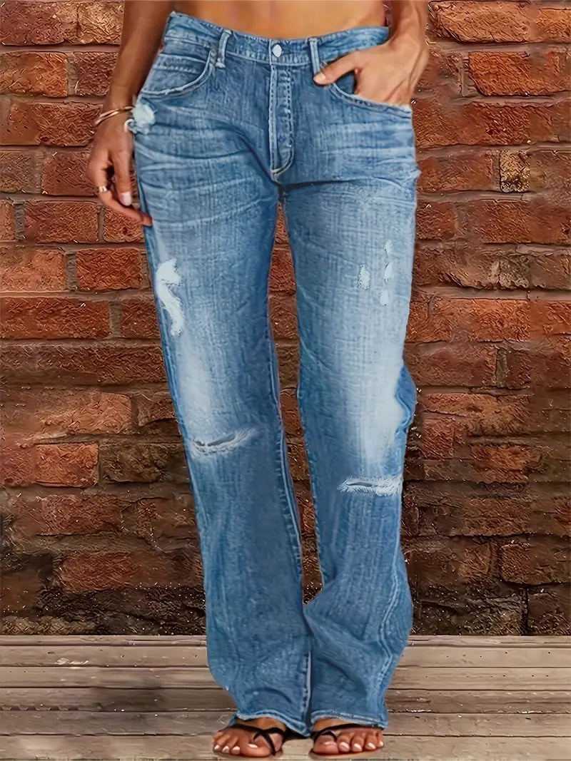 Women's Light Blue Distressed Straight Jeans High Stretch Casual