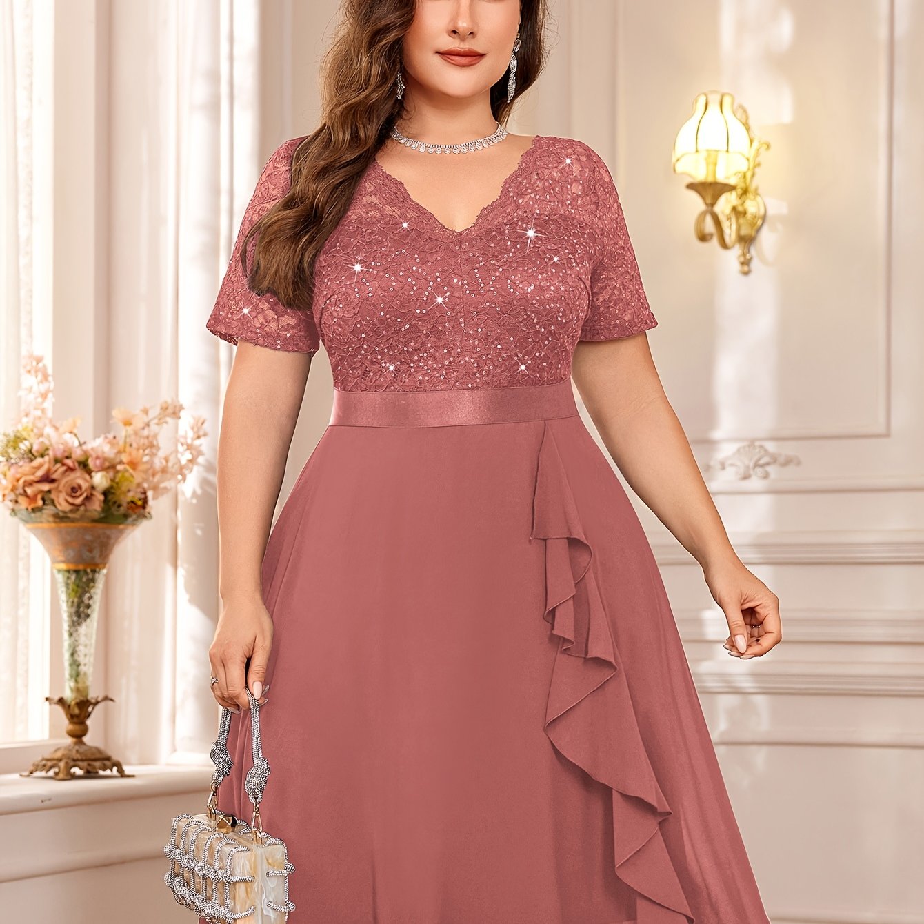 Women's Sequin Lace Chiffon V-Neck Cocktail Party Dress