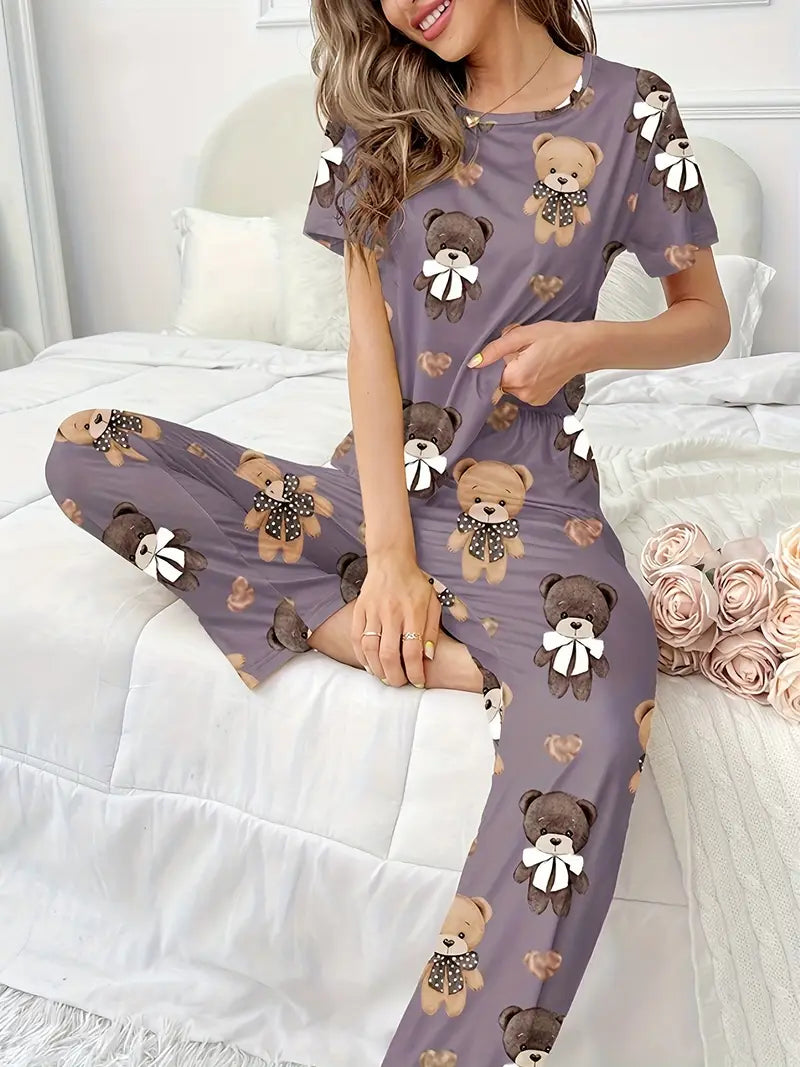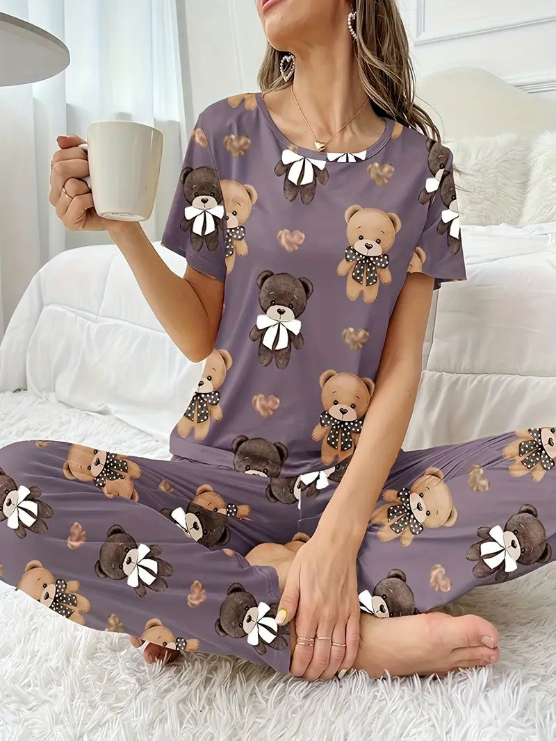 Women's Sleepwear Set with Cartoon Bear and Heart Print Short Sleeve Top and Elastic Pants