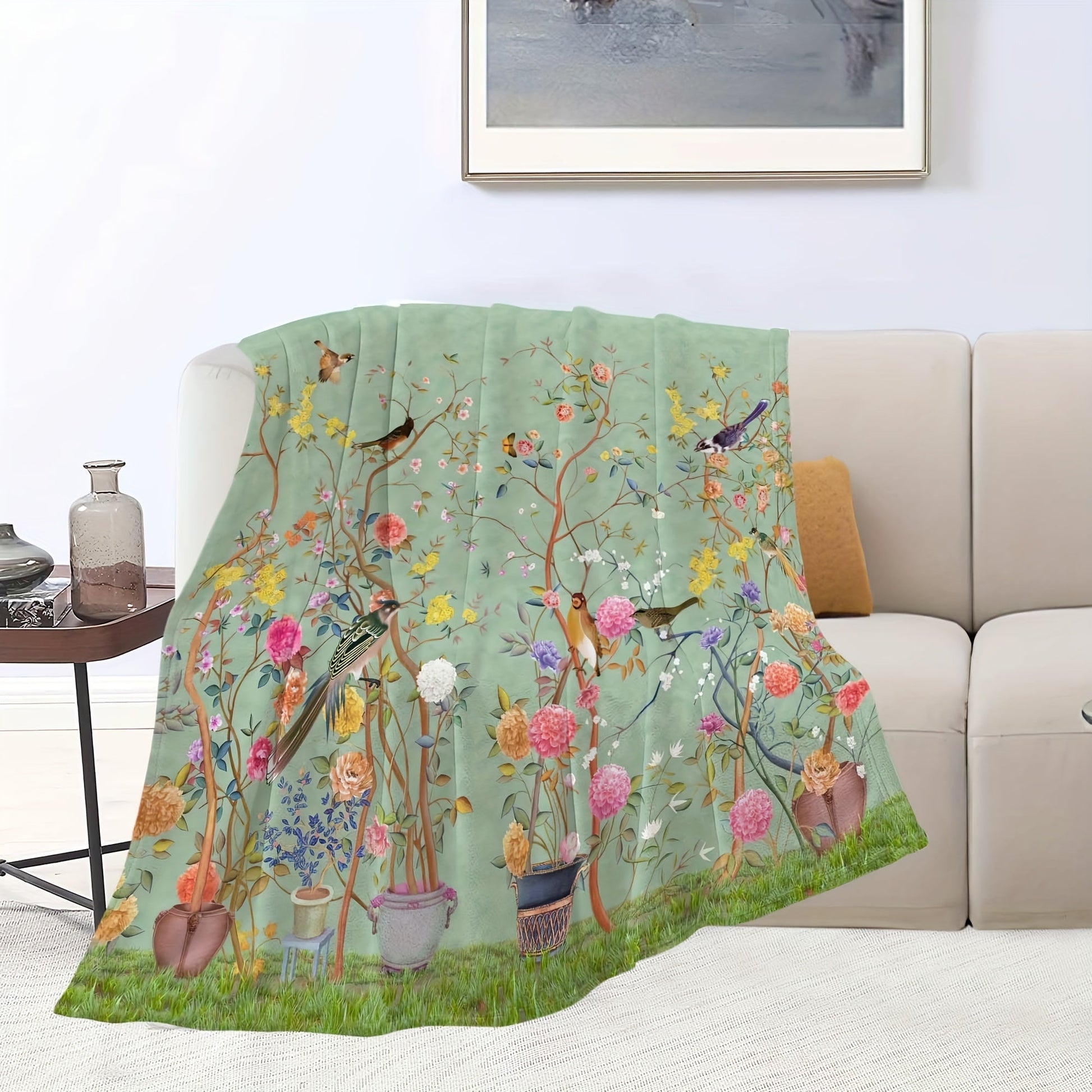 Flannel Blanket with Flower and Bird Pattern Cozy Soft Sofa Throw for All Seasons