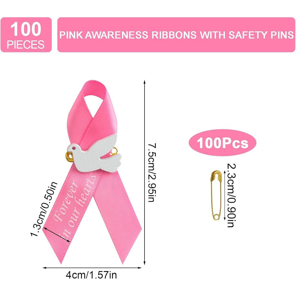 Pink Satin Ribbon Pins with Dove and "Forever in Our Hearts" Memorial Brooches