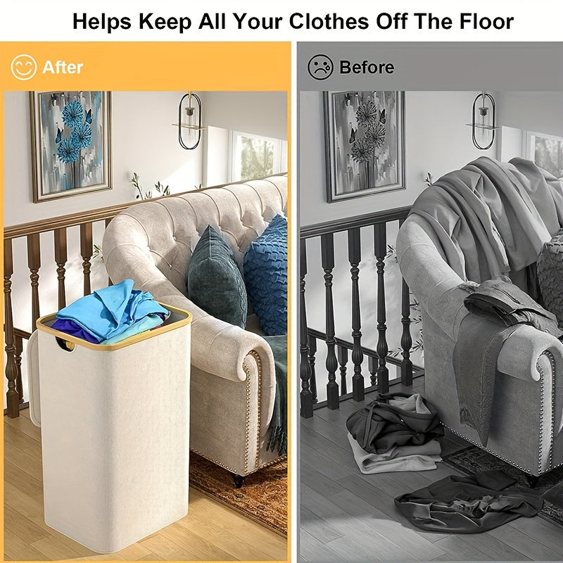 100L Tall Laundry Basket with Lid Bamboo Handles Waterproof Collapsible Storage Bin Cream White