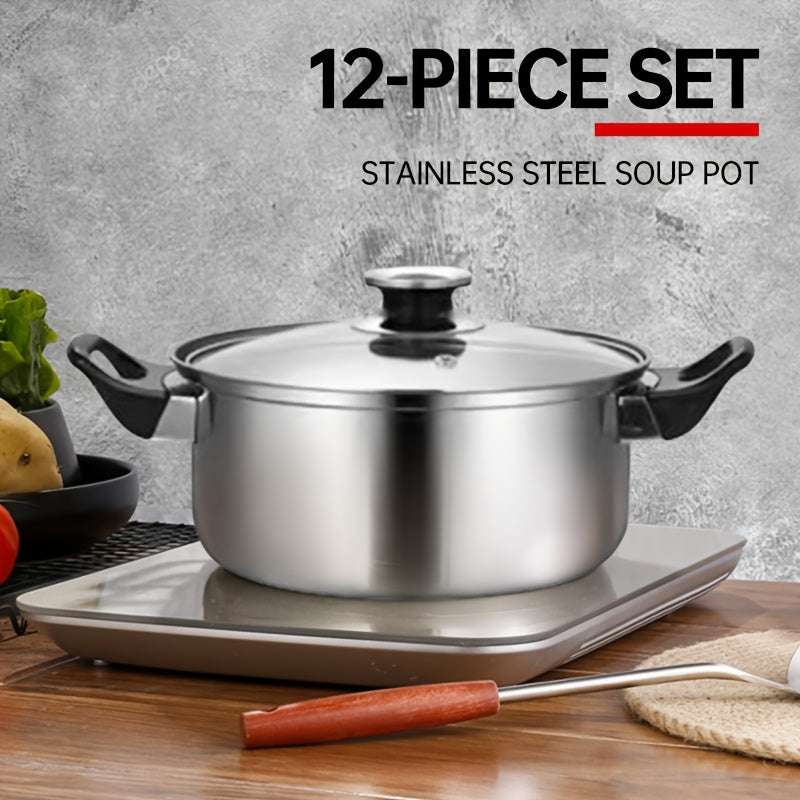 12-Piece Stainless Steel Cookware Set with Soup Pots Milk Pots and Kettle Natural Wood Grain Finish