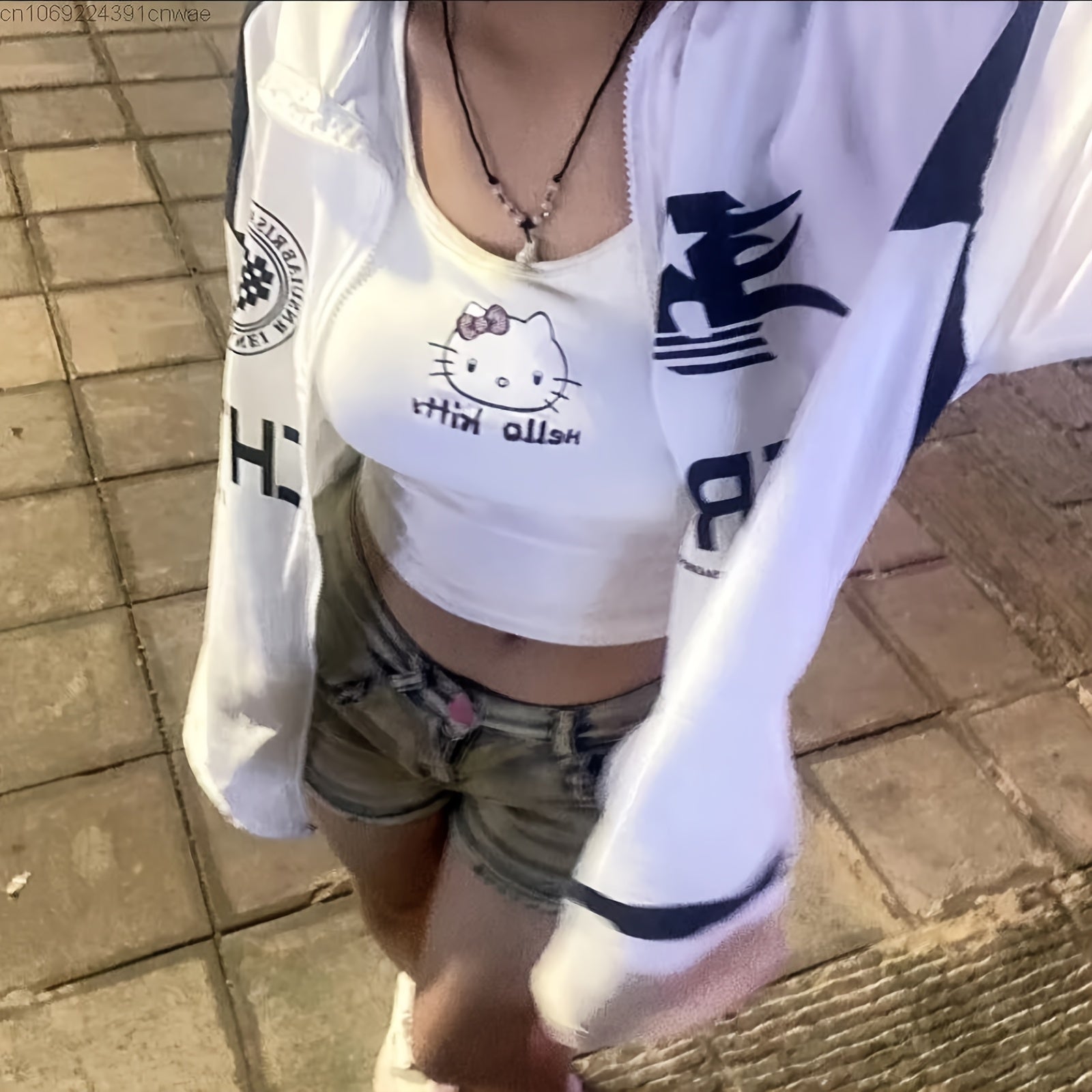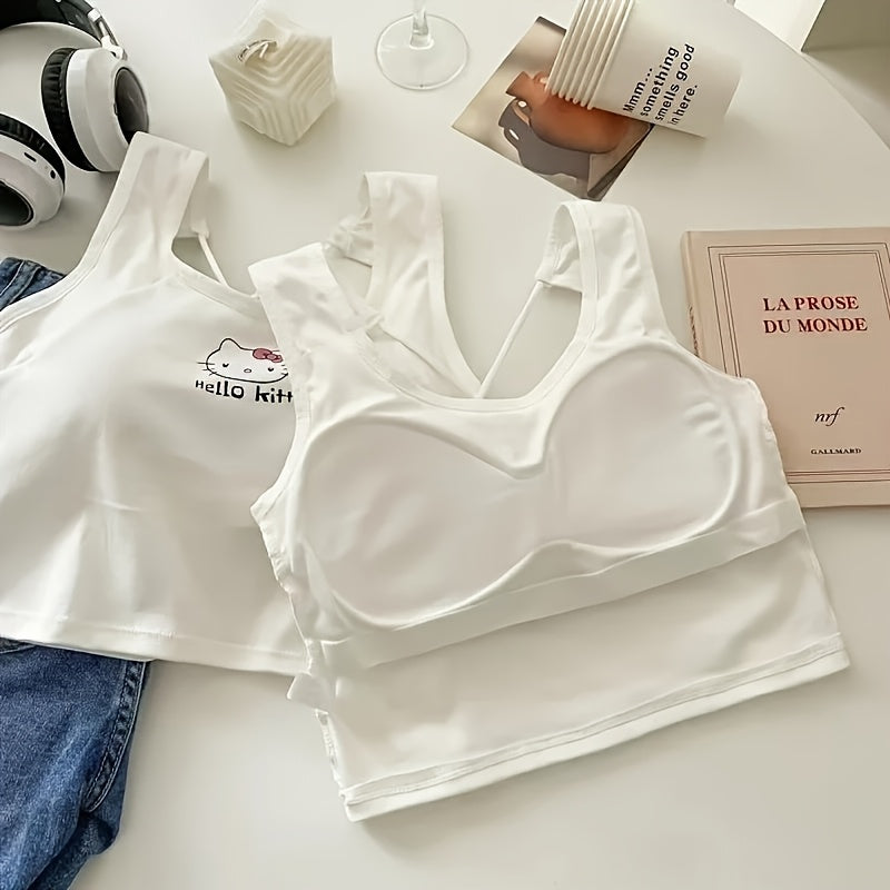 Anime-Themed Cotton Sleeveless Cropped Top for Women White with Pink Hello Kitty Design