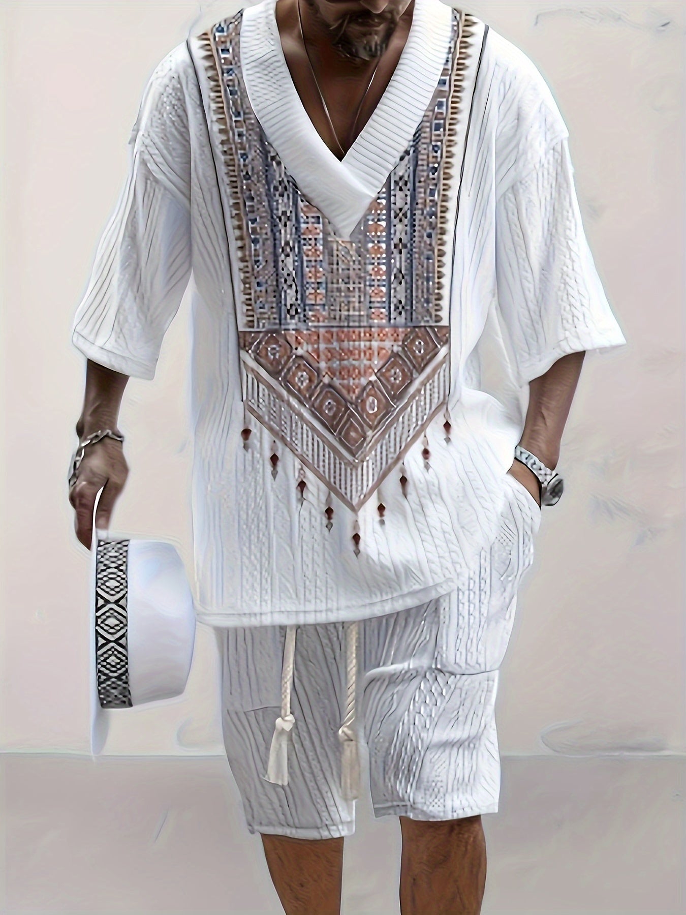 Men's Summer Casual Shorts and V-Neck T-Shirt Set Polyester Print Solid Color