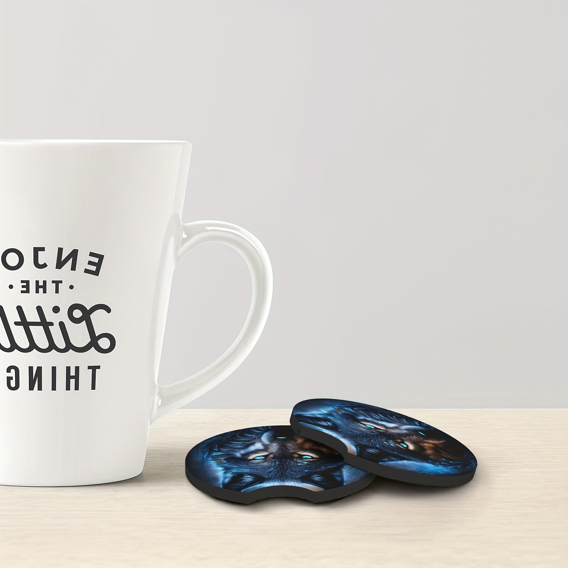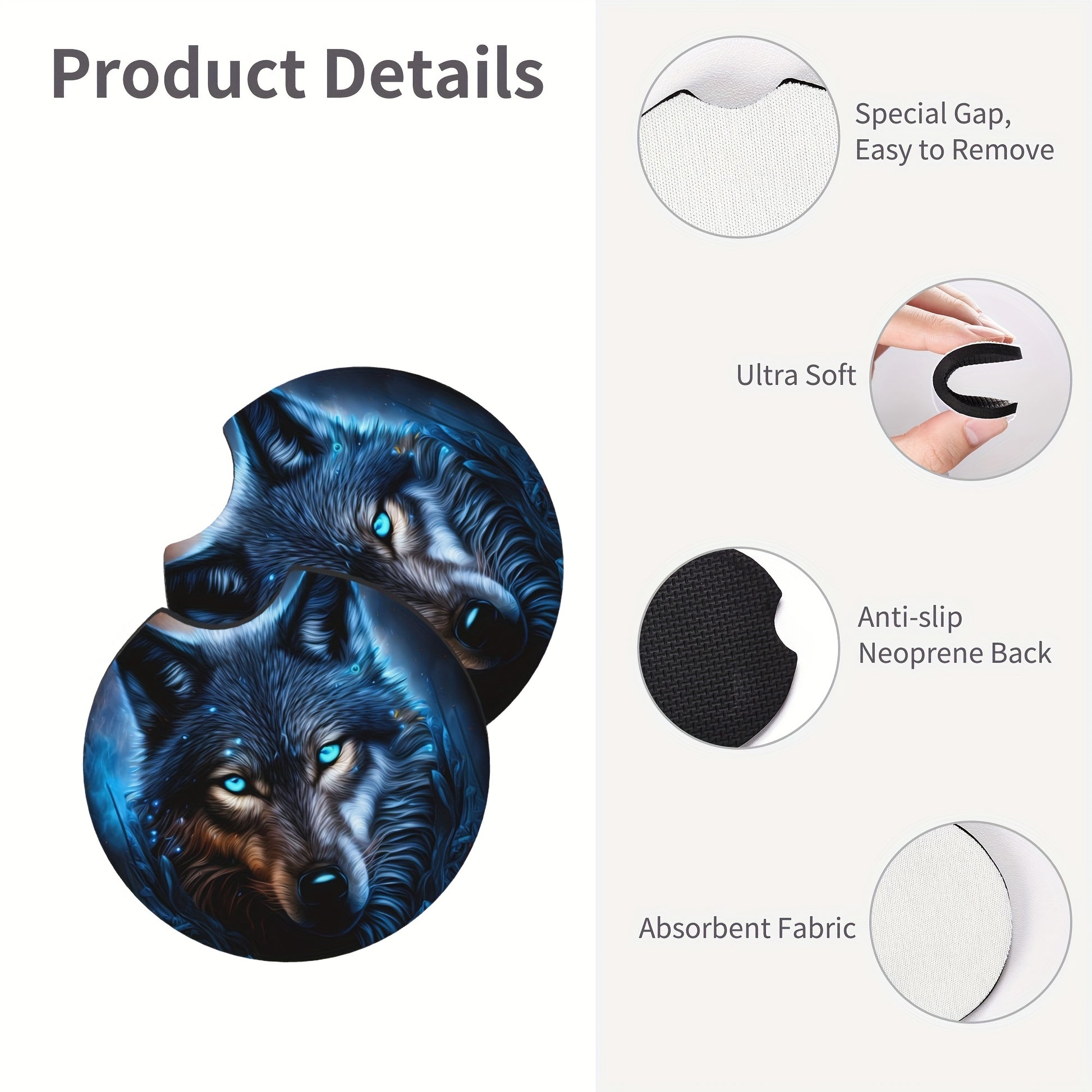 2pcs Blue Flame Wolf Pattern Absorbent Car Cup Holder Coasters Non-slip Rubber