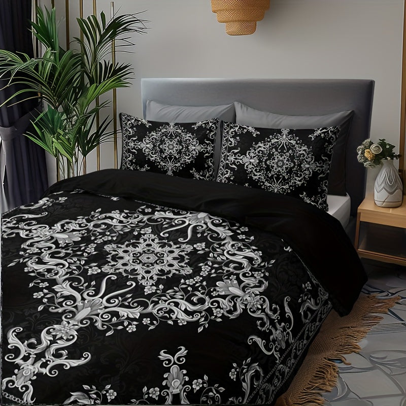 3-Piece Duvet Cover Set with Pillowcases Black and White Damask Digital Print Breathable Polyester All-Season