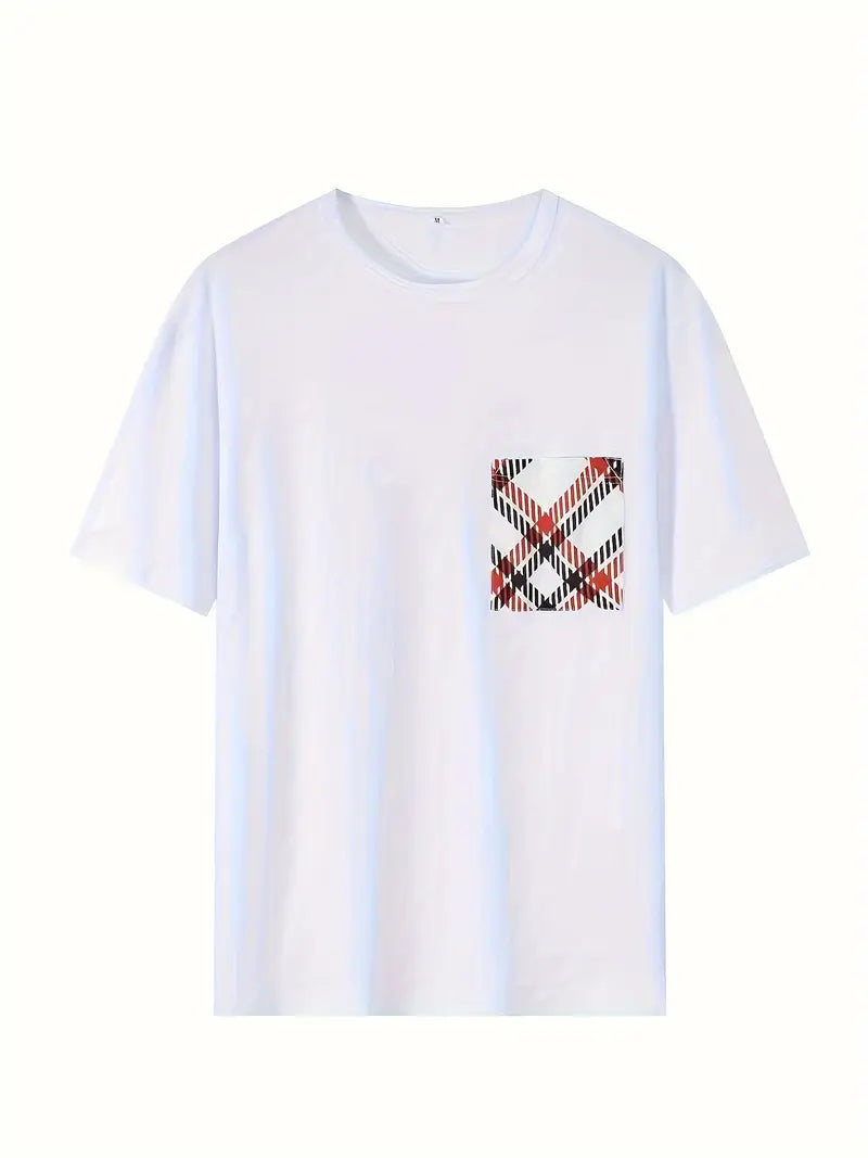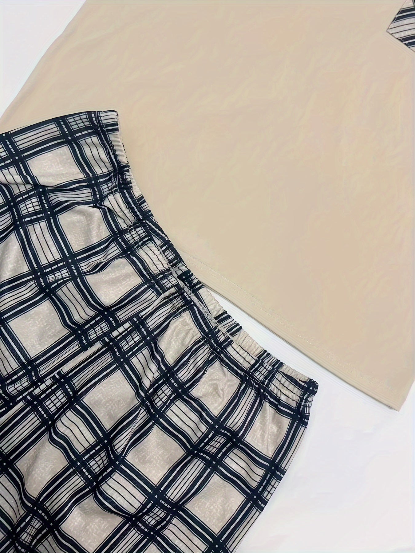 3-Piece Plaid Pajama Set Short Sleeve Crew Neck Top with Pocket Medium Stretch Polyester All-Season Comfort