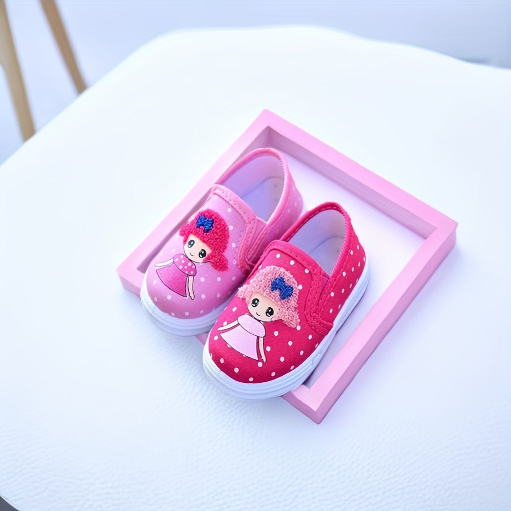 Girls' Pink Polka Dot Canvas Shoes with Cartoon Embroidery Breathable Lightweight for Spring and Fall