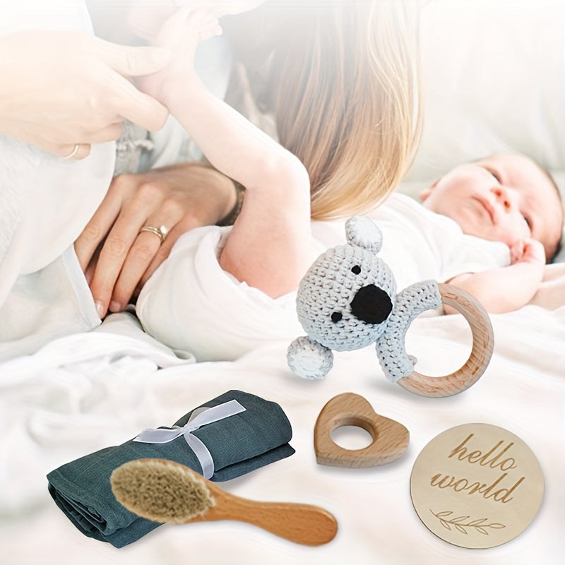 Baby Gift Set with Bamboo Towel Goat Hair Brush and Beechwood Koala Rattle