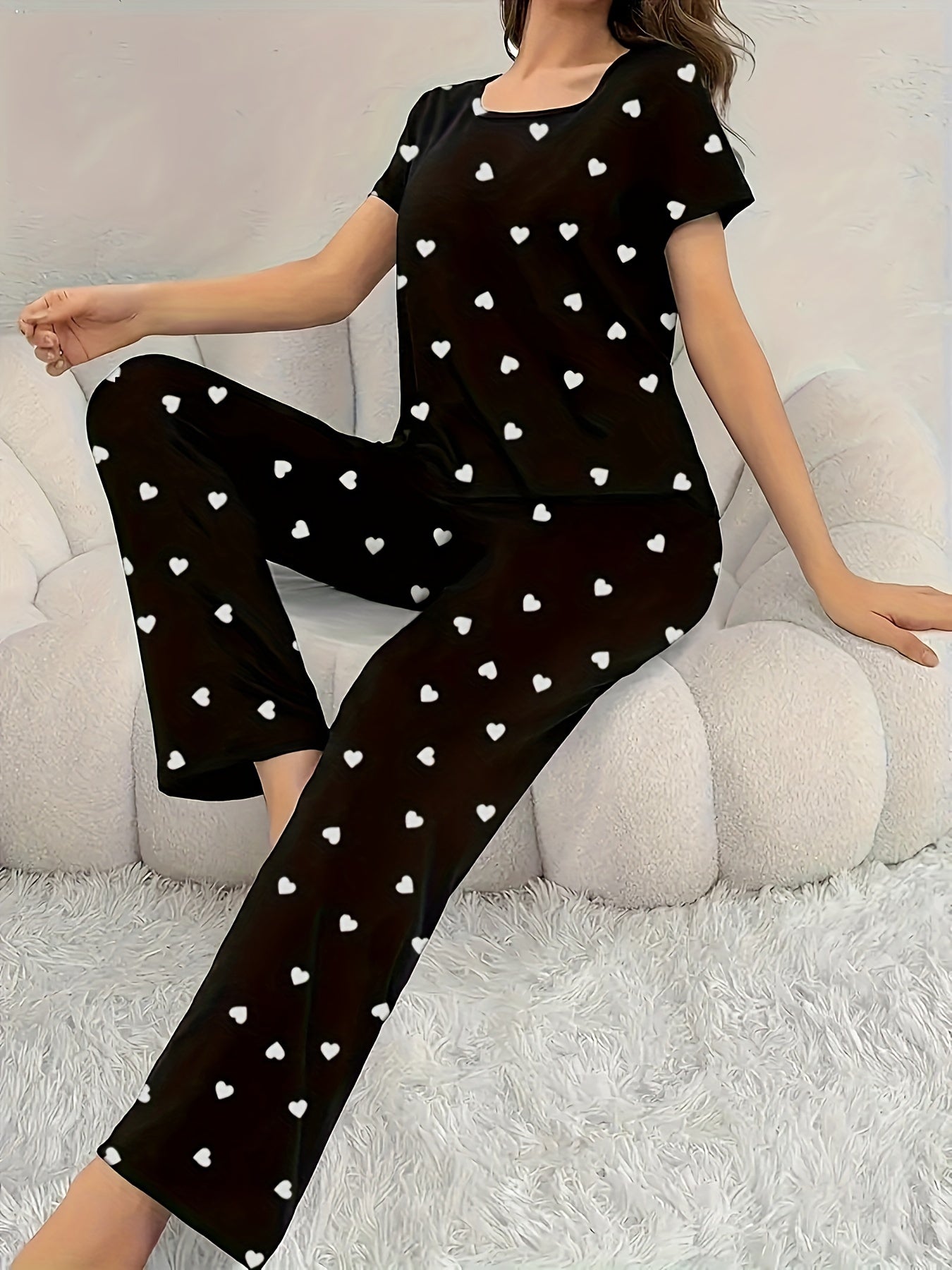 Women's Black Heart Print Pajama Set Jersey Knit Short Sleeve T-Shirt Long Pants