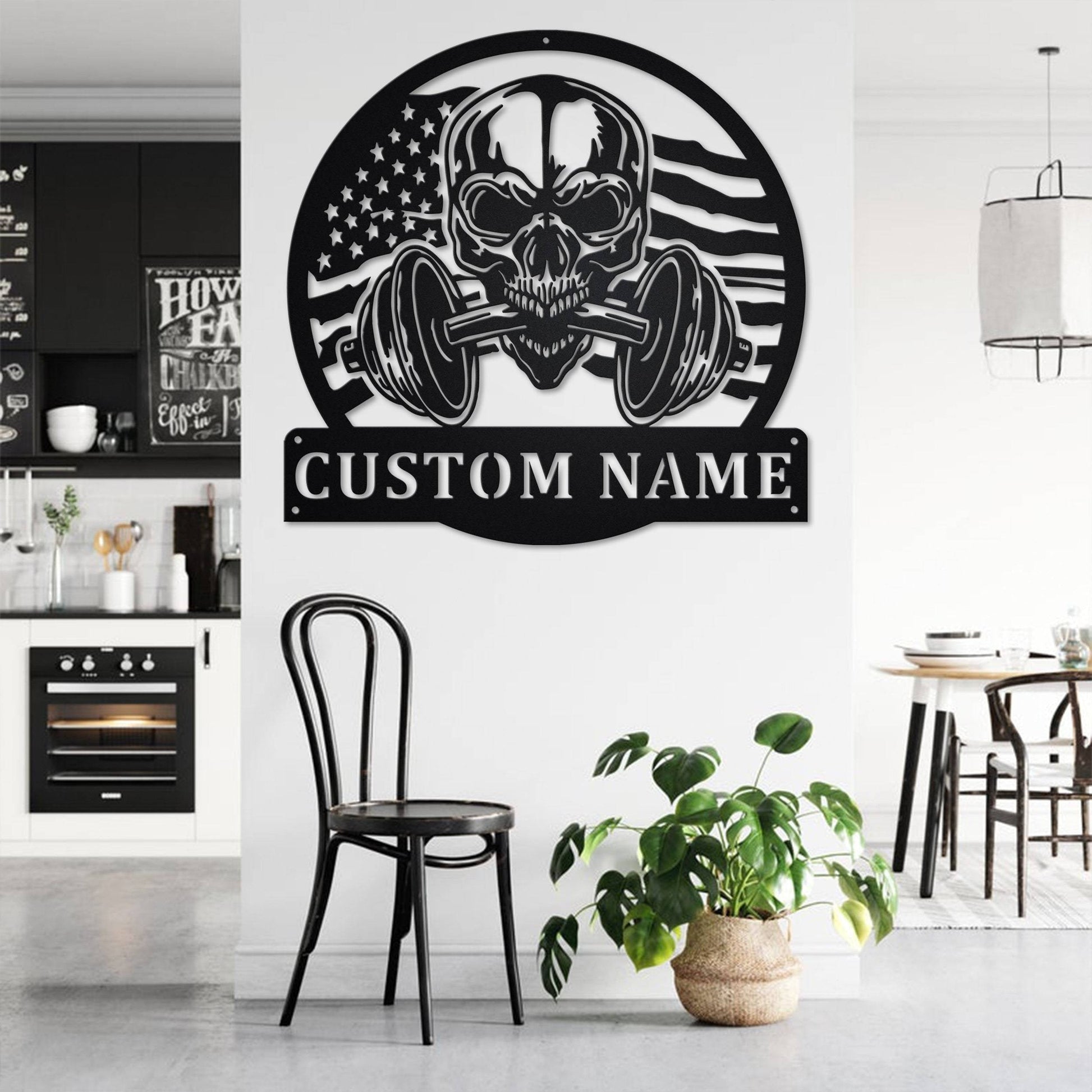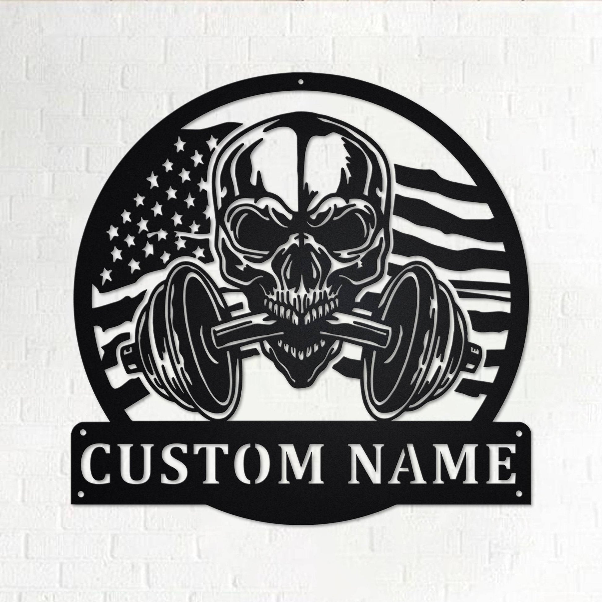 Black Metal Sign with US Flag and Skull Design for Gym Wall Art