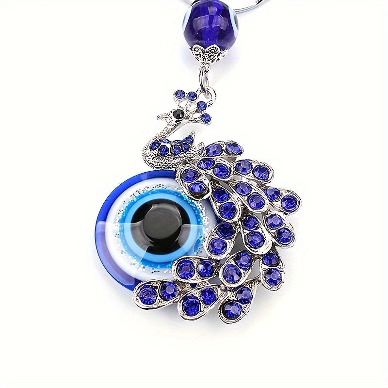 Blue Evil Eye Keychain with Rhinestone Peacock Design Alloy Bag Charm for Women