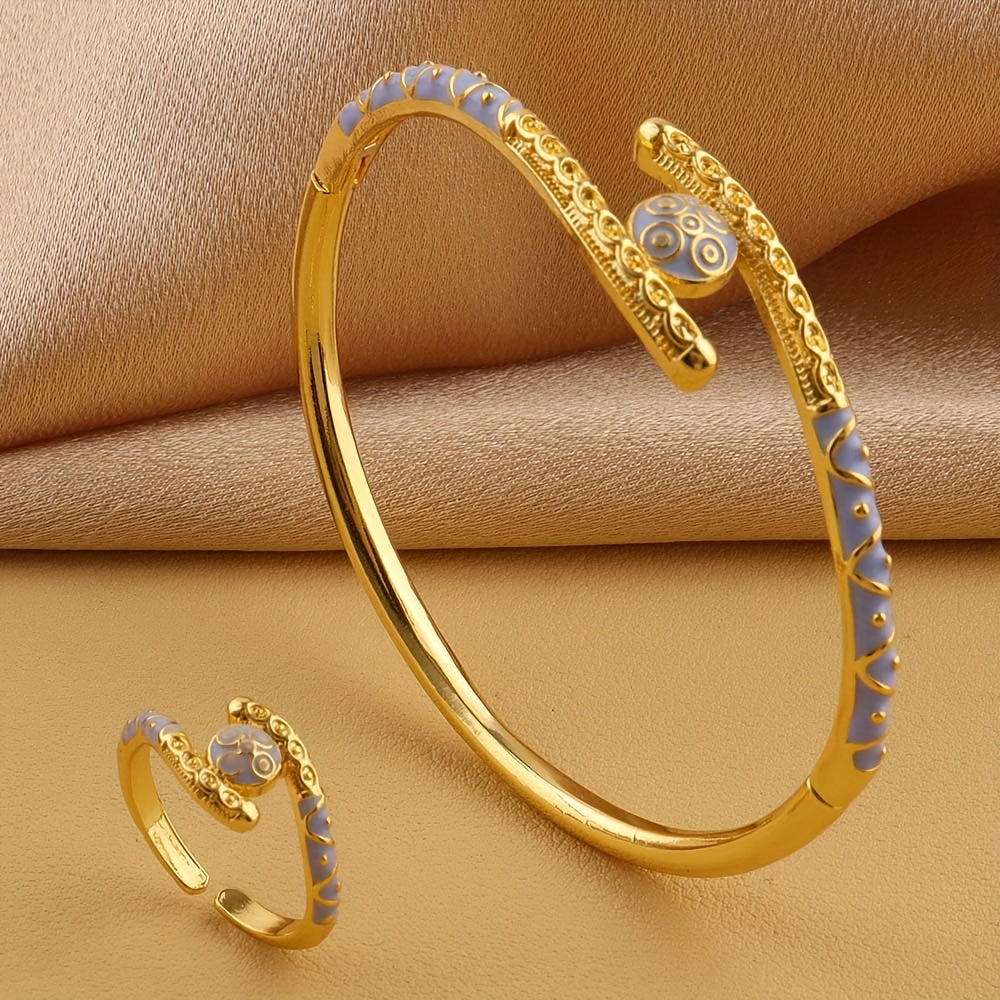 Women Boho Tribal Style Copper Cuff Bracelet and Adjustable Ring Set Gold Plated
