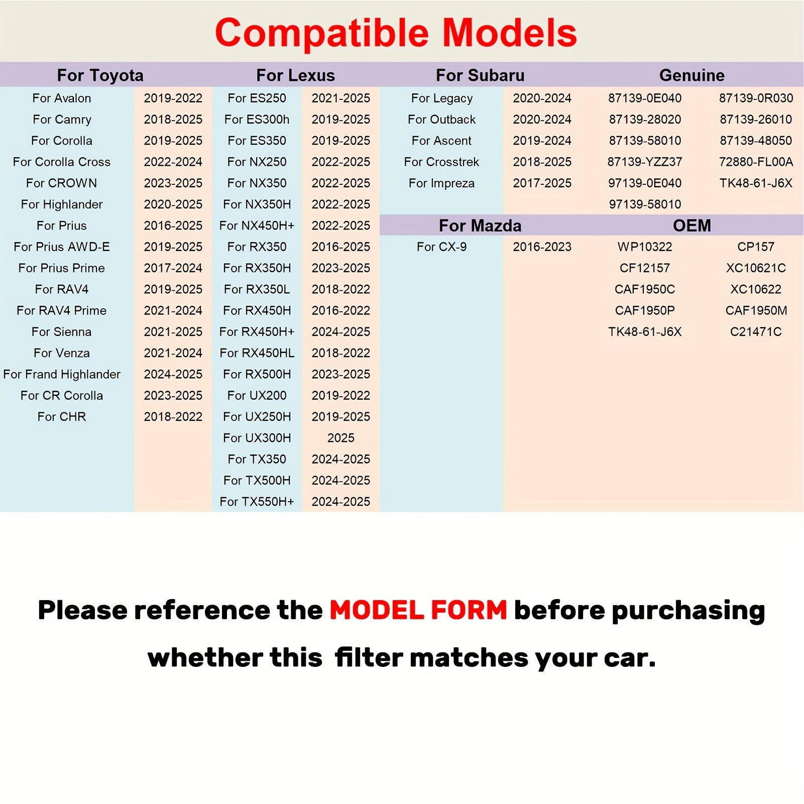 Cabin Air Filter Activated Carbon Compatible with Multiple SUVs and Sedans