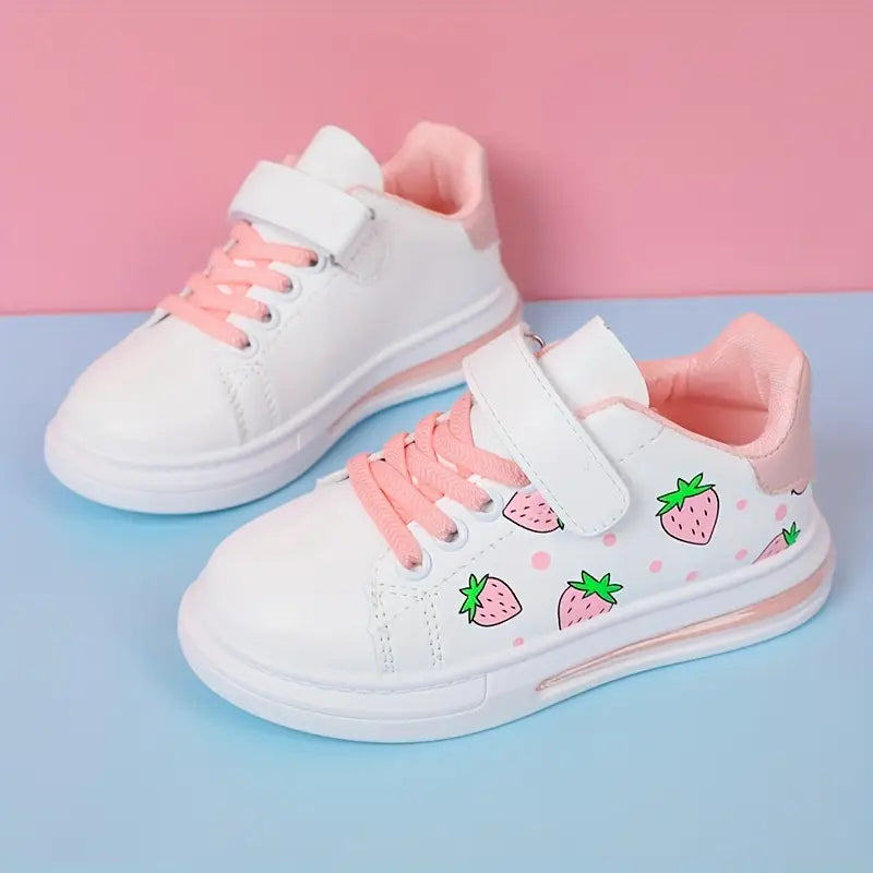 Girls Low Top Sneakers with Strawberry Cartoon Pattern All-Season Non-Slip Skateboard Shoes