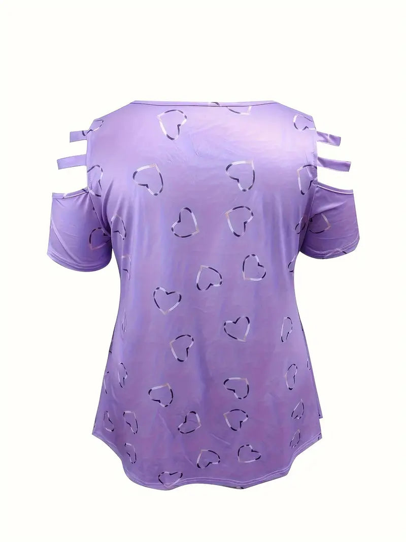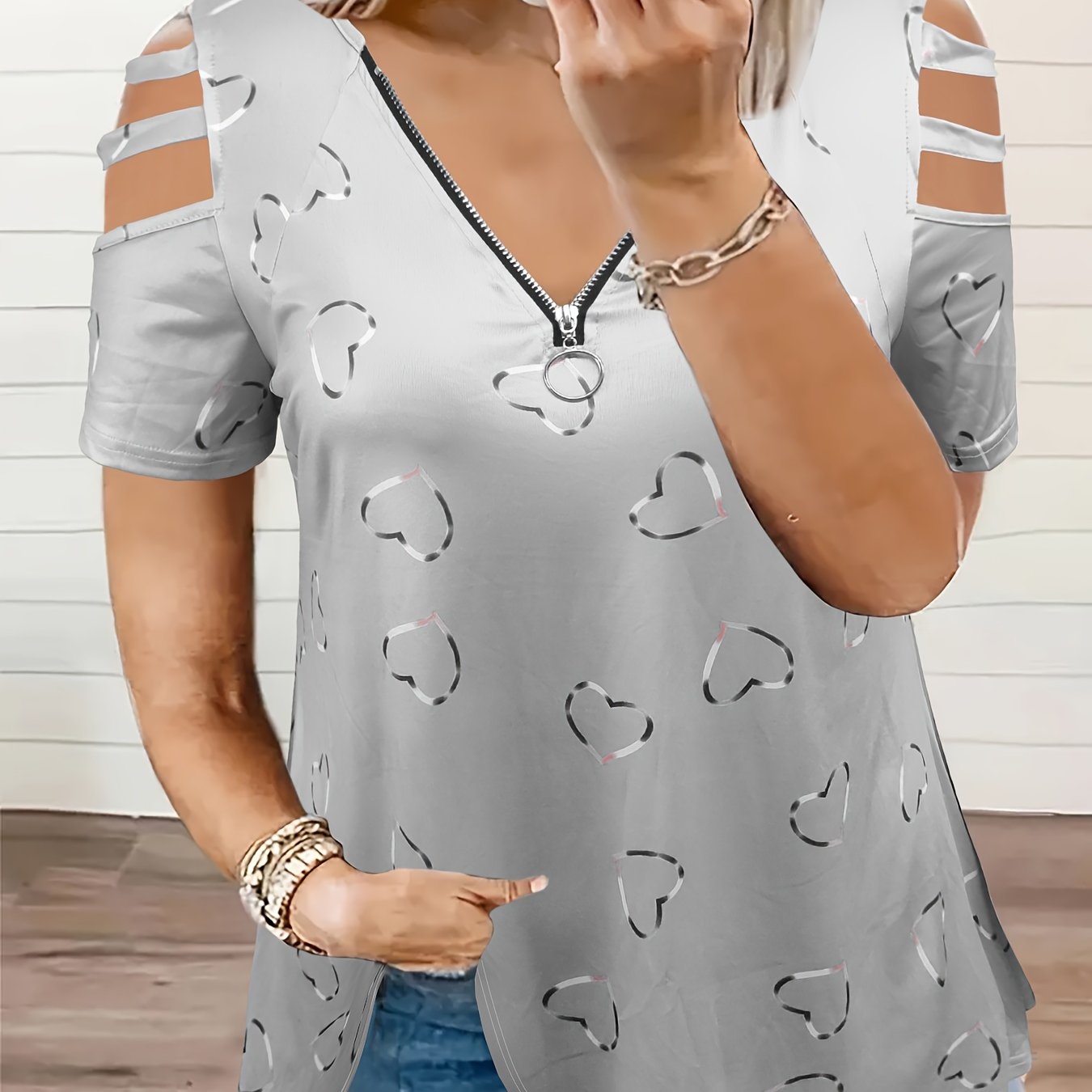 Women's Casual Polyester T-Shirt with Heart Print Zipper Short Sleeves V-Neck