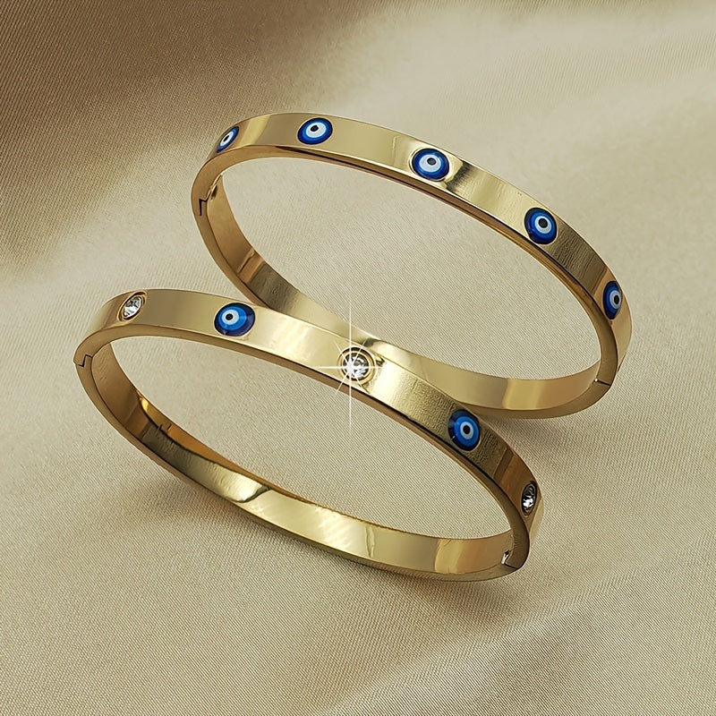 Stainless Steel Bracelet with Blue Evil Eye Charms and Rhinestones for Women