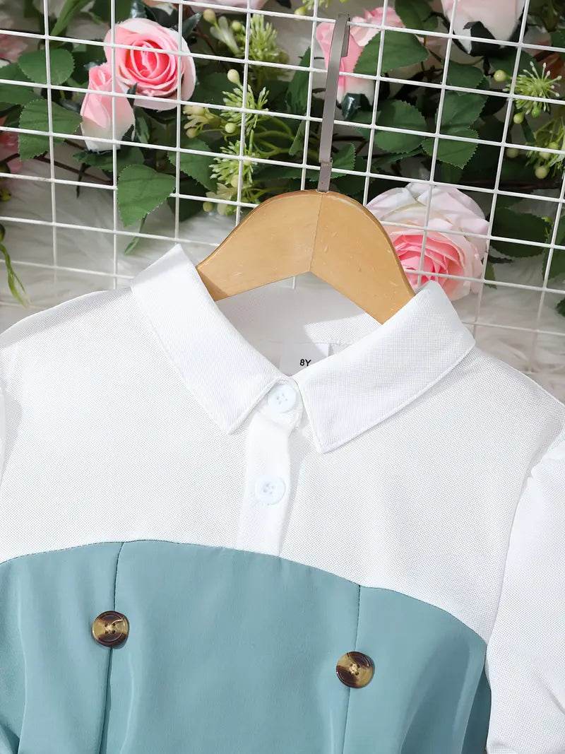 Girls Summer Dress Short Sleeve Collared Beige White Leopard Buttons Belt Casual Polyester