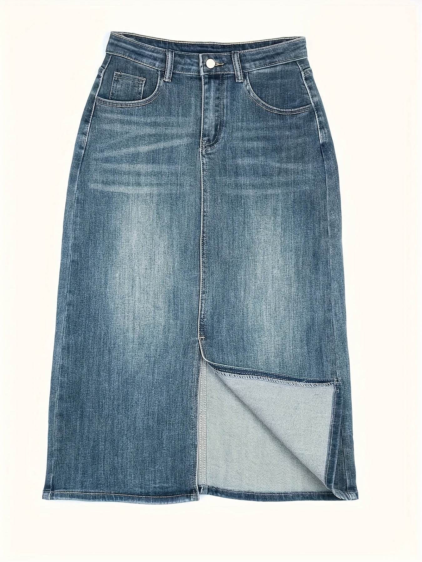 High-Waist Denim Midi Skirt with Split Stretch Non-See-Through Machine Washable for All Seasons