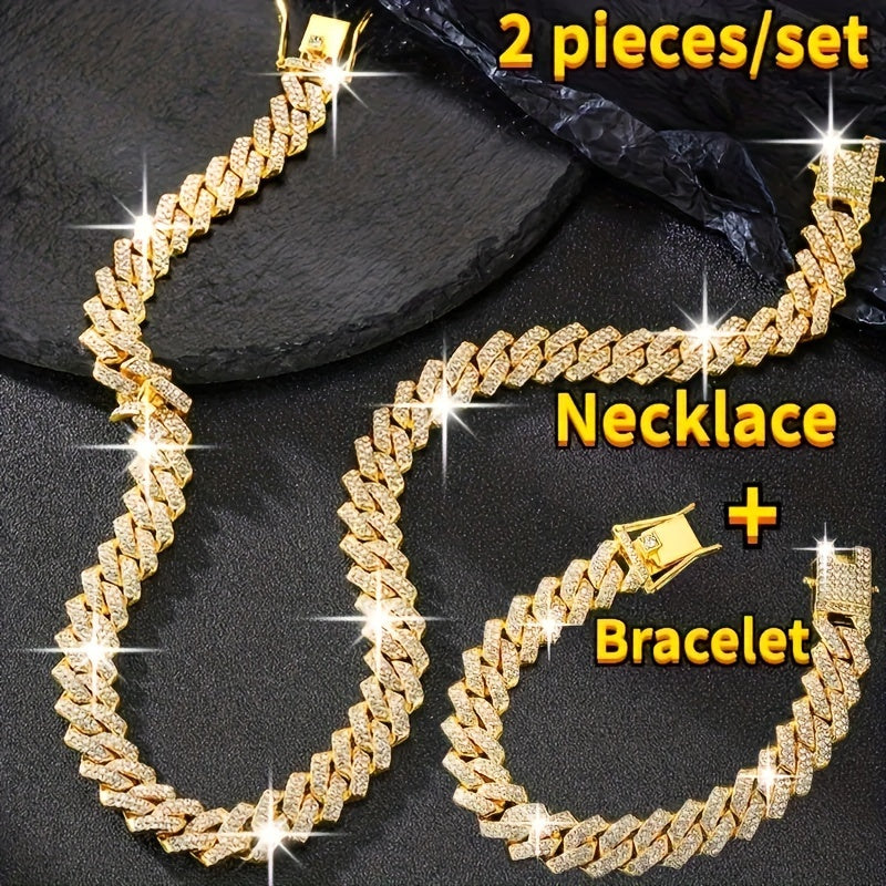 Y2K Rhinestone Cuban Link Chain Necklace and Bracelet Set for Hip Hop Style